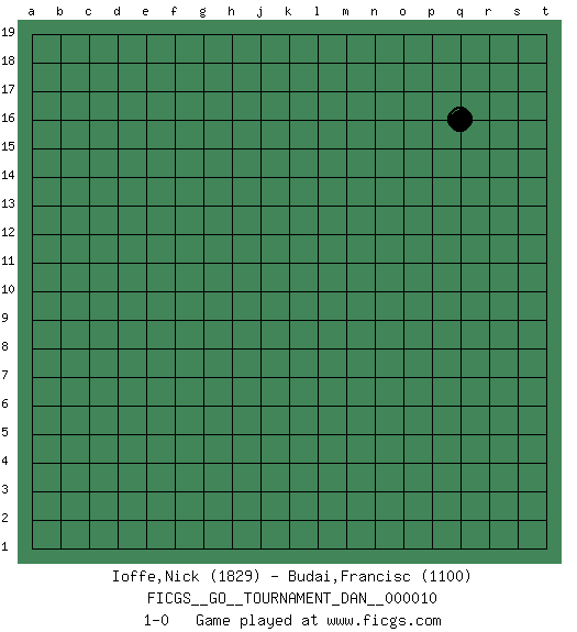 Last move : 1-0 2007 October 13 12:34:25 [Event "FICGS__GO__TOURNAMENT_DAN__000010"] [Site "FICGS"] [Date "2007.09.12"] [Round "1"] [Black "Ioffe,Nick"] [White "Budai,Francisc"] [Result "1-0"] [Rating 1 "1829"] [Rating 2 "1100"] 1.q16 1-0 This go game has been lost on time (started : 2007.09.12 22:50:50) Here are the names of the openings (joseki) played in the four corners : Player Black won this Go (weiqi, baduk) game. Follow this game move after move (download)One big eye kills one small eye. (Anonymous) There's no money in correspondence chess. (John Knudsen)