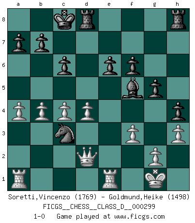 Last move : 1-0 2024 May 17 9:2:22 [Event "FICGS__CHESS__CLASS_D__000299"] [Site "FICGS"] [Date "2024.01.21"] [Round "1"] [White "Soretti,Vincenzo"] [Black "Goldmund,Heike"] [Result "1-0"] [WhiteElo "1769"] [BlackElo "1498"] 1.e4 d5 2.exd5 Qxd5 3.Nc3 Qa5 4.Nf3 Nf6 5.Bc4 c6 6.O-O Bg4 7.Bb3 e6 8.d3 Bd6 9.Bd2 Nbd7 10.Ne4 Qc7 11.Nxd6+ Qxd6 12.Bc3 O-O-O 13.Qe2 Nb6 14.Rad1 Nbd5 15.Bd2 Nf4 16.Qe3 N6d5 17.Bxd5 Nxd5 18.Qe2 h5 19.h3 Bf5 20.Ne5 Qc7 21.c4 Nf6 22.Bf4 Nd7 23.Ng6 Bxg6 24.Bxc7 Kxc7 25.b4 h4 26.a4 Nf6 27.d4 Ne4 28.Qe3 Bf5 29.Qf4+ Kc8 30.Rfe1 Nc3 31.Ra1 f6 32.f3 g5 33.Qd2 1-0 Follow this game move after move (download)There is no remorse like the remorse of Chess. (H. G. Wells) Das Schachspiel ist ein See, in welchem eine Mücke baden und ein Elefant ertrinken kann. (Emanuel Lasker) Solo los afeminados hacen el Enroque. (Rob Sillars) Pour moi, les échecs ne sont pas un jeu mais un art. (Alexandre Alekhine) Good decisions come from experience, and experience comes from bad decisions. (Anonymous)