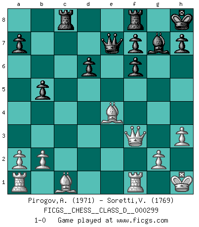 Last move : 1-0 2024 February 24 9:23:41 [Event "FICGS__CHESS__CLASS_D__000299"] [Site "FICGS"] [Date "2024.01.21"] [Round "1"] [White "Pirogov,Andrey Mikhaylovich"] [Black "Soretti,Vincenzo"] [Result "1-0"] [WhiteElo "1971"] [BlackElo "1769"] 1.d4 Nf6 2.c4 g6 3.Nc3 Bg7 4.e4 O-O 5.Nf3 d6 6.Be2 Bg4 7.O-O Qd7 8.h3 Bxf3 9.Bxf3 Nc6 10.d5 Ne5 11.Be2 c6 12.f4 Nxc4 13.Bxc4 b5 14.Bb3 cxd5 15.Nxd5 Nxd5 16.Bxd5 Rac8 17.f5 gxf5 18.exf5 Kh8 19.Kh1 Qc7 20.f6 exf6 21.Qf3 Qe7 22.Be4 1-0 Follow this game move after move (download)It is difficult to play against Einstein's theory --on his first loss to Fischer. (Mikhail Tal) Ich hatte meine größten Erfolge, als ich 47 Jahre alt war. Kasparow war noch nicht mal 42 und hat das Schach schon im Stich gelassen. (Viktor Kortschnoi) Cuando no sepas que mover, espera por una idea que se le venga a la la cabeza de tu oponente. Tenlo por seguro de que esa idea estará incorrecta. (Siegbert Tarrasch) Ce qui caractérise les parties de combat, c'est que si le défenseur a constamment de difficiles problèmes à résoudre, l'attaquant doit chercher sans relâche de nouvelles possibilités d'attaque. (Koblentz) The next best thing to gambling and winning is gambling and loosing. (Nick Dandalos)