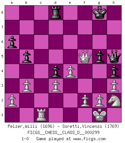 Last move : 1-0 2024 March 28 17:48:42 [Event "FICGS__CHESS__CLASS_D__000299"] [Site "FICGS"] [Date "2024.01.21"] [Round "1"] [White "Pelzer,Willi"] [Black "Soretti,Vincenzo"] [Result "1-0"] [WhiteElo "1696"] [BlackElo "1769"] 1.e4 e5 2.Nf3 Nc6 3.Bb5 d6 4.O-O Bd7 5.c3 Nf6 6.d3 Be7 7.h3 a6 8.Ba4 O-O 9.Re1 b5 10.Bb3 Na5 11.Bc2 c5 12.Qe2 Nc6 13.Be3 d5 14.Nbd2 d4 15.Bg5 h6 16.Bh4 Nh7 17.Bg3 f6 18.cxd4 cxd4 19.Rec1 Be6 20.Nh4 Qe8 21.Bb3 Bxb3 22.Nxb3 Ng5 23.Qg4 h5 24.Qe2 Bd6 25.Nf5 Bb8 26.Qc2 Ne7 27.Nh4 Bd6 28.Nxd4 exd4 29.Bxd6 Rf7 30.Qe2 Rd8 31.Bxe7 Rxe7 32.Rc5 g6 33.Nf3 Ne6 34.Rc2 Nf4 35.Qd2 g5 36.Rac1 h4 37.Nh2 Qf7 38.b3 f5 39.Rc5 Qh5 40.Rxf5 Rf7 41.Qxf4 Rxf5 42.Qxf5 1-0 Follow this game move after move (download)There's never before been a Chess player with such a thorough knowledge of the intricacies of the game and such an absolutely indomitable will to win. I think Bobby is the greatest player that ever lived. (Lisa Lane) Besser ein falscher Plan, logisch durchgeführt, als gar kein Plan. (Viktor Kortschnoi) Tu no necesitas jugar muy bien, únicamente ayudar a tu oponenet a que juegue muy mal. (Genrikh Chepukaitis) Il (Jacob Murray) ne joue pas pour le bon coup, mais pour le meilleur. (Eloi Relange) Two beer, or not two beer. (Unknown)