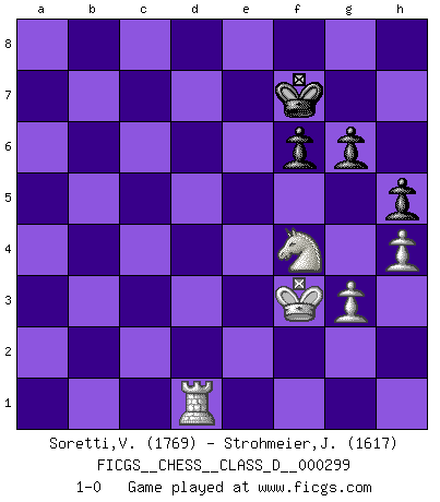 Last move : 1-0 2024 May 4 21:50:10 [Event "FICGS__CHESS__CLASS_D__000299"] [Site "FICGS"] [Date "2024.01.21"] [Round "1"] [White "Soretti,Vincenzo"] [Black "Strohmeier,Josef"] [Result "1-0"] [WhiteElo "1769"] [BlackElo "1617"] 1.e4 c5 2.Nf3 Nc6 3.d4 cxd4 4.Nxd4 Nf6 5.Nc3 e6 6.a3 d6 7.Bb5 Bd7 8.O-O Be7 9.Re1 O-O 10.Nxc6 Bxc6 11.Bxc6 bxc6 12.Be3 Qc7 13.Qe2 Rab8 14.b4 a5 15.Reb1 axb4 16.axb4 d5 17.Ra7 Rb7 18.Rxb7 Qxb7 19.Bc5 Bxc5 20.bxc5 Qa7 21.Qe3 Nd7 22.exd5 exd5 23.f3 Qxc5 24.Qxc5 Nxc5 25.Rb6 Rc8 26.Kf2 Ne6 27.g3 g6 28.Ne2 c5 29.c3 d4 30.cxd4 cxd4 31.Rd6 Rc2 32.h4 Kf8 33.f4 Ke7 34.Rd5 h5 35.Kf3 Rd2 36.Re5 f6 37.Ra5 Kd6 38.f5 d3 39.fxe6 Kxe6 40.Nf4+ Kf7 41.Rd5 Rd1 42.Nxd3 Ke6 43.Nf4+ Kf7 44.Rxd1 1-0 Follow this game move after move (download)A sacrifice is best refuted by accepting it. (Wilhelm Steinitz) Über die Verhaftung Bobby Fischers: Warum es die Bush-Administration für nötig befindet einen 61 Jahre alten Mann zu hetzten, der für niemanden ausser sich selbste eine Gefahr darstellt ist ein Rätsel. (Nigel Short) Los Peones son nacidos libres, y aún así, se encuentran por doquier encadenados. (Rick Kennedy) Un millionnaire : 'Monsieur Steinitz ! Vous ne participez aux tournois que pour l'argent, alors que moi je n'y viens que pour l'honneur.' Steinitz : 'Chacun joue pour ce qu'il n'a pas'... There are two kinds of tragedy in this world, one is not getting what you want and the other is getting. (Lord of war)