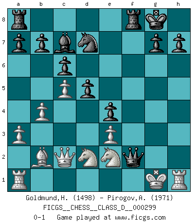 Last move : 0-1 2024 April 20 18:52:0 [Event "FICGS__CHESS__CLASS_D__000299"] [Site "FICGS"] [Date "2024.01.21"] [Round "1"] [White "Goldmund,Heike"] [Black "Pirogov,Andrey Mikhaylovich"] [Result "0-1"] [WhiteElo "1498"] [BlackElo "1971"] 1.b4 e5 2.Bb2 f6 3.a3 d5 4.e3 Be6 5.d3 Bd6 6.Nf3 Nd7 7.Nbd2 Nh6 8.Be2 O-O 9.c4 c6 10.O-O Qe7 11.Qc2 Nf7 12.c5 Bc7 13.h3 f5 14.Rfe1 e4 15.dxe4 fxe4 16.Nd4 Bxh3 17.gxh3 Ng5 18.f4 Nxh3+ 19.Kh2 Nxf4 20.Rh1 Qh4+ 21.Kg1 Nxe2+ 22.Nxe2 Qf2+ 0-1 Follow this game move after move (download)In life, as in Chess, one's own Pawns block one's way. A man's very wealth, ease, leisure, children, books, which should help him to win, more often checkmate him. (Charles Buxton) Der Partner hat auch seine Existenzberechtigung. (Savielly Grigorievitsch Tartakower) Si pudieramos observar el interior de la cabeza de un jugador de Ajedrez, encontraríamos ahí un mundo lleno de sentimientos, imágenes, ideas, emoción y pasión. (Alfred Binet) Je menace de comprendre la position. (Anonyme) Better than a thousand days of diligent study is one day with a great teacher. (Japanese proverb)