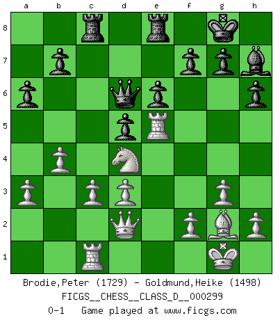 Last move : 0-1 2024 August 20 23:0:41 [Event "FICGS__CHESS__CLASS_D__000299"] [Site "FICGS"] [Date "2024.01.21"] [Round "1"] [White "Brodie,Peter"] [Black "Goldmund,Heike"] [Result "0-1"] [WhiteElo "1729"] [BlackElo "1498"] 1.e4 d5 2.exd5 Qxd5 3.Nc3 Qa5 4.Nf3 Nf6 5.Be2 Bf5 6.d3 e6 7.Bd2 c6 8.O-O Qc7 9.Re1 Bd6 10.g3 O-O 11.Qc1 Nbd7 12.Nd4 Bg6 13.Bg5 h6 14.Bxf6 Nxf6 15.Qe3 Rfe8 16.Qd2 Be5 17.Nf3 Bd6 18.Nh4 Bh7 19.Nf3 Rad8 20.Bf1 Bb4 21.a3 Bd6 22.Bg2 Nd5 23.Nxd5 cxd5 24.Nd4 a6 25.b4 Be5 26.c3 Rc8 27.Rac1 Qb6 28.Rxe5 Qd6 0-1 This chess game has been lost on time (started : 2024.01.21 0:35:24) Follow this game move after move (download)I thought the most common mistake [in chess] was the first one: Learning the game :P (Garvin Gray, FICGS forum) Als er Schachweltmeister wurde ließ er praktisch alle stärksten Sovietspieler für sich arbeiten. Wenn ein auch nur mittelmässiger Meister ein Spezialist für eine bestimmte Eröffnung war, wurde er von Karpov gerufen. Das wurde alles geheim gehalten. (Mikhail Moiseyevich Botvinik) El hombre es un frívolo, una creatura engañosa y como un jugador de Ajedrez, se preocupa mas por el proceso de obtener su meta que de la meta por sí misma. (Dostoyevsky) La menace est plus forte que l'exécution. (Aaron Nimzovitch) The real danger is not that computers will begin to think like men, but that men will begin to think like computers. (Sydney J. Harris)