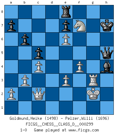 Last move : 1-0 2024 August 23 16:25:50 [Event "FICGS__CHESS__CLASS_D__000299"] [Site "FICGS"] [Date "2024.01.21"] [Round "1"] [White "Goldmund,Heike"] [Black "Pelzer,Willi"] [Result "1-0"] [WhiteElo "1498"] [BlackElo "1696"] 1.d4 Nf6 2.Nf3 g6 3.Bf4 d6 4.e3 Bg7 5.Bd3 O-O 6.O-O Nbd7 7.c4 b6 8.Nbd2 Re8 9.Qc2 Bb7 10.b3 Nh5 11.Bg5 c5 12.Be2 Rc8 13.Rad1 Qc7 14.h3 f5 15.Nh4 Nhf6 16.d5 Ne5 17.Ndf3 Nf7 18.Bd3 Rcd8 19.Rfe1 Bc8 20.g4 Nxg5 21.Nxg5 h6 22.Ne6 Bxe6 23.dxe6 fxg4 24.Bxg6 gxh3 25.Bxe8 h2+ 26.Kxh2 Rxe8 27.Nf5 d5 28.f4 Ng4+ 29.Kh3 h5 30.Rxd5 Bf6 31.Rg1 Qc6 32.Nh6+ Kh8 33.Rxh5 Qf3+ 34.Rg3 Nf2+ 35.Qxf2 Qxh5+ 36.Kg2 Bh4 37.Nf7+ Kh7 38.Qc2+ 1-0 Follow this game move after move (download)The passed Pawn is a criminal, who should be kept under lock and key. Mild measures, such as police surveillance, are not sufficient. (Aaron Nimzovich) Ein Remis kann durch Wiederholung von drei Zügen oder durch einen schlechte Zug erreicht werden. (Savielly Grigorievitsch Tartakower) En la perfecta combinación de Ajedrez como en una historia corta de primera clase, toda la trama y contra trama deberá conducir hacia un final sorprendente, el interes no es mitigado hasta el último momento. (Yates and Winter) Le joueur d'Echecs qui veut atteindre le top est obligé de développer son propre credo créatif. Alexeï Stepanovicth Souétine. Il est facile d'écrire des livres ! Ce qui est difficile, c'est de jouer ! (Alexeï Stepanovicth Souétine) SEO proverb : Make your website optimized for human beings, not for search engines.