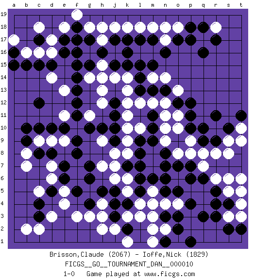 Last move : 1-0 2007 November 17 7:9:41 [Event "FICGS__GO__TOURNAMENT_DAN__000010"] [Site "FICGS"] [Date "2007.09.12"] [Round "1"] [Black "Brisson,Claude"] [White "Ioffe,Nick"] [Result "1-0"] [Rating 1 "2067"] [Rating 2 "1829"] 1.q16 d16 2.q3 d3 3.r9 l3 4.d5 d7 5.f5 f3 6.c3 c2 7.c4 b2 8.h5 h3 9.d10 b7 10.f9 f7 11.g7 f6 12.g6 e5 13.e6 e4 14.e7 d6 15.f8 r6 16.r4 o6 17.m4 n2 18.o3 p9 19.p10 n9 20.p17 l16 21.f17 h17 22.f15 d14 23.f13 k13 24.c17 d17 25.c15 c16 26.d15 b16 27.b15 c18 28.k15 l15 29.l14 k14 30.j15 n17 31.j17 n14 32.m13 j18 33.k17 k18 34.l17 l18 35.m17 m18 36.n16 m16 37.o17 n18 38.m15 g18 39.l9 o10 40.p11 o11 41.o12 n12 42.n13 o13 43.p12 m14 44.k16 m12 45.l13 l12 46.l15 k11 47.m10 k9 48.l8 n10 49.m11 l10 50.m9 n11 51.n8 o8 52.n7 r8 53.q9 q8 54.o7 s9 55.s10 r10 56.q10 s8 57.r11 s5 58.p7 p8 59.q6 s3 60.s4 t4 61.r5 s6 62.t5 t6 63.s2 h13 64.j11 g11 65.h10 e11 66.c12 e13 67.f12 g14 68.f14 j7 69.j4 k5 70.k4 l4 71.l5 q7 72.p6 t9 73.b9 r18 74.r17 k3 75.j12 h15 76.a16 a17 77.a15 m5 78.l6 n4 79.n5 m3 80.n6 k12 81.q18 h9 82.g10 h12 83.f11 c9 84.c10 b8 85.b10 d9 86.o2 k8 87.k7 k6 88.l7 h7 89.j3 j2 90.r3 e9 91.e10 o4 92.p4 h4 93.j5 j6 94.g4 g3 95.n3 m2 96.o5 t3 97.t2 t5 98.m6 m4 99.e17 j14 100.j10 k10 101.e16 e18 102.h16 g16 103.g15 j16 104.j9 j8 105.h16 h14 106.g17 j16 107.k2 h2 108.h16 h18 109.f18 f19 110.f16 t10 111.t11 o18 112.p18 o1 113.p1 k1 114.n1 m1 115.d8 c5 116.c8 1-0 Here are the names of the openings (joseki) played in the four corners : Corner d4 : d3 d5 Komoku (Somok, Xiao~mu`) 3-4 Point. The komoku (3-4) point is the traditional corner enclosure move.. Ikken Takagakari (Hankan Nop'dakeolch'im, Yi Gaogua`jiao~, 1-Space High Approach). The 5-4 approach move has become more popular in modern times, as modern Go emphasizes speed and influence. Corner d16 : d16 f17 Hoshi (Hwajeom, Seongjeom, Xingwei`) 4-4 Point. The star or hoshi (4-4) point, emphasizing influence at the potential expense of territory. Ikken Kakari (Hankan Keolch'im, Yi Gua`jiao~, 1-Space Low Approach). Black 2 is the standard approach move to the 4-4. Player Black won this Go (weiqi, baduk) game. Follow this game move after move (download)Strike at the waist of the knight's move. (Anonymous) Men should grow up. - Yeah. And dogs should stop licking themselves. It's not gonna happen. (Gregory House to Dr. Cameron, House M.D.)