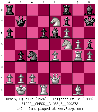 Last move : 1-0 2024 June 18 17:12:48 [Event "FICGS__CHESS__CLASS_B__000372"] [Site "FICGS"] [Date "2024.01.28"] [Round "1"] [White "Droin,Augustin"] [Black "Trigance,Emile"] [Result "1-0"] [WhiteElo "1926"] [BlackElo "1838"] 1.e4 c5 2.Nf3 d6 3.d4 cxd4 4.Nxd4 Nf6 5.Nc3 g6 6.Be3 Bg7 7.f3 O-O 8.Qd2 Nc6 9.g4 Ne5 10.h4 h5 11.g5 Nfd7 12.f4 Ng4 13.Bg1 a6 14.O-O-O Nb6 15.f5 Qc7 16.Be2 Ne5 17.Rh3 Nbc4 18.Qe1 b5 19.Nd5 Qb7 20.Rg3 Bd7 21.Nxe7+ Kh7 22.f6 Bh8 23.Kb1 b4 24.Ndf5 Be6 25.Bxh5 gxh5 26.Qe2 Ng4 27.Rxg4 1-0 Follow this game move after move (download)We cannot resist the fascination of sacrifice, since a passion for sacrifices is part of a Chessplayer's nature. (Rudolf Spielman) Wer nie einen Fehler gemacht hat, hat nie etwas Neues ausprobiert. (Albert Einstein) El Ajedrez es un juego de pelea el cual es puramente intelectual e incluye la suerte. (Richard Reti) Toute estimation doit être constamment réévaluée. (Jacob Estrin) Wikichess, chess moves explained by 'experimented' players. (Thibault de Vassal)