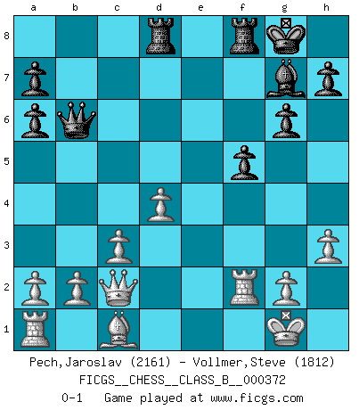 Last move : 0-1 2024 June 23 10:58:58 [Event "FICGS__CHESS__CLASS_B__000372"] [Site "FICGS"] [Date "2024.01.28"] [Round "1"] [White "Pech,Jaroslav"] [Black "Vollmer,Steve"] [Result "0-1"] [WhiteElo "2161"] [BlackElo "1812"] 1.e4 d6 2.d4 Nf6 3.Nc3 g6 4.f4 c6 5.Nf3 Bg7 6.Bd3 Bg4 7.h3 Bxf3 8.Qxf3 Na6 9.Bxa6 bxa6 10.e5 Nd5 11.Nxd5 cxd5 12.Qxd5 Rc8 13.c3 Qb6 14.O-O dxe5 15.fxe5 O-O 16.Rf2 Rcd8 17.Qe4 f5 18.exf6 exf6 19.Qc2 f5 0-1 This chess game has been lost on time (started : 2024.01.28 23:8:9) Follow this game move after move (download)Do you realize Fischer almost never has any bad pieces? He exchanges them, and the bad pieces remain with his opponents. (Yuri Balashov) Meine Liebe ist Schach, Schach, Schach. Ich muss jeden Tag Schach spielen, deshalb fühle ich mich so stark. (Miguel Najdorf) Yo creo que el Ajedrez posee una magia que es también una ayuda en la edad avanzada. Una rodilla reumática es olvidada durante una partida de Ajedrez y otros eventos pueden parecer algo sin importancia comparada a una catástrofe en el tablero de Ajedrez. (Vlastimil Hort) Toutes choses étant égales, c'est la conviction qui gagne. Alliée à une volonté de vaincre, elle sert de détonateur, suscite des idées, disperse les doutes et aide à penser clairement. (Robert Fischer) Good luck. You're gonna need it. (Han Solo in Star Wars ep.6)