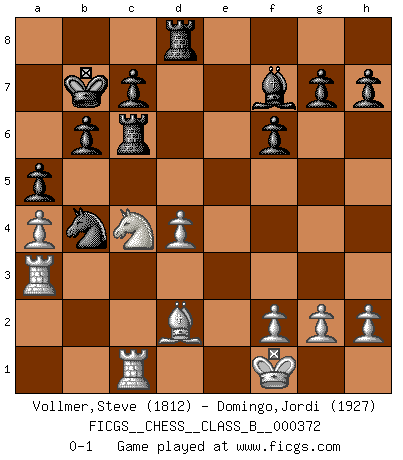 Last move : 0-1 2024 March 17 10:38:32 [Event "FICGS__CHESS__CLASS_B__000372"] [Site "FICGS"] [Date "2024.01.28"] [Round "1"] [White "Vollmer,Steve"] [Black "Domingo,Jordi"] [Result "0-1"] [WhiteElo "1812"] [BlackElo "1927"] 1.d4 d5 2.c4 dxc4 3.e3 e5 4.Bxc4 exd4 5.Qxd4 Qxd4 6.exd4 Nc6 7.Be3 Bb4+ 8.Nc3 Na5 9.Be2 Bf5 10.Nf3 Ne7 11.O-O O-O-O 12.a3 Bxc3 13.bxc3 Nd5 14.c4 Nc3 15.Rfe1 Nxe2+ 16.Rxe2 Bd3 17.Rb2 Nxc4 18.Rb4 Nb6 19.Ne5 Bg6 20.a4 f6 21.Nf3 Nd5 22.Rb3 a5 23.Rc1 Rhe8 24.Bd2 b6 25.Be3 Re6 26.Nd2 Be8 27.Ra3 Kb7 28.Nc4 Rc6 29.Kf1 Bf7 30.Bd2 Nb4 0-1 Follow this game move after move (download)Pawn endings are to Chess what putting is to golf. (Cecil Purdy) Am wohlsten fühle ich mich, wenn ich sehe, wie sich mein Gegner im Todeskampf windet. (Robert James Fischer) Bobby Fischer es el mas grande genio de Ajedrez de todos los tiempos. (Alexander Kotov) Il (Jacob Murray) ne joue pas pour le bon coup, mais pour le meilleur. (Eloi Relange) It is not titles that honor men, but men that honor titles. (Niccolo Machiavelli)