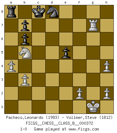 Last move : 1-0 2024 May 4 13:1:1 [Event "FICGS__CHESS__CLASS_B__000372"] [Site "FICGS"] [Date "2024.01.28"] [Round "1"] [White "Pacheco,Leonardo"] [Black "Vollmer,Steve"] [Result "1-0"] [WhiteElo "1983"] [BlackElo "1812"] 1.d4 Nf6 2.Bg5 d5 3.Nd2 Bf5 4.c4 c6 5.Qb3 Qb6 6.Qxb6 axb6 7.Bxf6 gxf6 8.cxd5 cxd5 9.e3 e5 10.Bb5+ Nc6 11.Ngf3 Bd6 12.O-O Rg8 13.Rfc1 Kd7 14.g3 h5 15.e4 Be6 16.exd5 Bxd5 17.Bc4 Bxc4 18.Nxc4 Ra6 19.dxe5 Bxe5 20.Rd1+ Kc7 21.a4 Rg4 22.Rac1 Re4 23.b3 Ra8 24.Nfxe5 fxe5 25.Nd6 Rb4 26.Nb5+ Kc8 27.Rc3 Kb8 28.Rd7 Rd4 29.Rxf7 Kc8 30.Rc7+ Kb8 31.Rh7 h4 32.Rh8+ Rd8 33.Rxd8+ Nxd8 34.gxh4 Ne6 35.Rg3 Kc8 36.Rg8+ Nd8 37.Rg7 1-0 Follow this game move after move (download)The older I grow, the more I value pawns. (Paul Keres) Auf jeden Fall musst du zuerst Rechtsanwalt werden, damit du deine eigenen Interessen und die deiner Familie vertreten kannst. [Brief an seinen Sohn] (José Raúl Capablanca) El Ajedrez lo es todo: arte, ciencia y deporte. (Anatoly Karpov) Un millionnaire : 'Monsieur Steinitz ! Vous ne participez aux tournois que pour l'argent, alors que moi je n'y viens que pour l'honneur.' Steinitz : 'Chacun joue pour ce qu'il n'a pas'... Have no fear of perfection - you'll never reach it. (Salvador Dali)