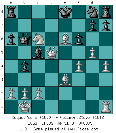 Last move : 1-0 2024 April 28 12:26:21 [Event "FICGS__CHESS__RAPID_B__000395"] [Site "FICGS"] [Date "2024.01.28"] [Round "1"] [White "Roque,Pedro"] [Black "Vollmer,Steve"] [Result "1-0"] [WhiteElo "1870"] [BlackElo "1812"] 1.e4 c5 2.Nf3 d6 3.d4 cxd4 4.Nxd4 Nf6 5.Nc3 a6 6.f3 Nc6 7.Be3 e6 8.g4 Be7 9.Qd2 Bd7 10.O-O-O Qc7 11.g5 Ng8 12.h4 b5 13.f4 f6 14.Nxc6 Bxc6 15.Bh3 b4 16.Ne2 Bxe4 17.Bxe6 Bxh1 18.Rxh1 Qa5 19.Nd4 d5 20.Kb1 Bc5 21.Nc6 Qb6 22.Qxd5 1-0 Follow this game move after move (download)Checkers is for tramps. (Paul Morphy) Um sich vor der Gefahr einer Erkältung zu schützen, sorge der wanderlustige König beizeiten für ein brauchbares Versteck. (Aaron Nimzowitsch) Cuando me preguntan: -¿Cual es el secreto que te hace hacer mejores movidas que tus oponentes?, Yo respondo: Me da gusto que me pregunten eso, porque, como veran, hay una simple razón. Yo pienso mis propias movidas y dejo a mi oponente que el piense las suyas. (Alexander Alekhine) Le système Elo représente seulement une moyenne. Il est simplement un indicateur de votre stabilité. (Anatoli Karpov) Pretend inferiority and encourage his arrogance. (Sun Tzu)