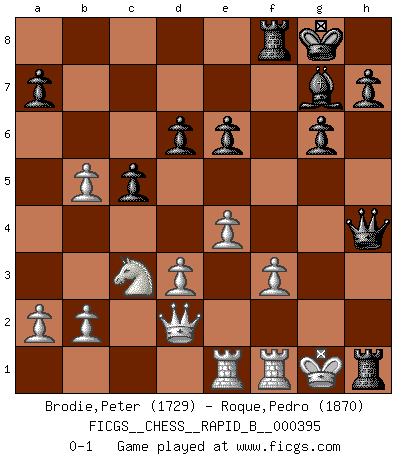 Last move : 0-1 2024 April 30 21:41:10 [Event "FICGS__CHESS__RAPID_B__000395"] [Site "FICGS"] [Date "2024.01.28"] [Round "1"] [White "Brodie,Peter"] [Black "Roque,Pedro"] [Result "0-1"] [WhiteElo "1729"] [BlackElo "1870"] 1.e4 c5 2.c4 Nc6 3.Nc3 g6 4.Nf3 Bg7 5.Be2 d6 6.O-O Bg4 7.d3 e6 8.Bg5 Nge7 9.h3 Bxf3 10.Bxf3 Nd4 11.Bxe7 Qxe7 12.Qa4+ b5 13.cxb5 Nxf3+ 14.gxf3 O-O 15.Qd1 f5 16.Qd2 fxe4 17.fxe4 Rf3 18.Kg2 Raf8 19.Rae1 Qh4 20.Kg1 Rxh3 21.f3 Rh1+ 0-1 Follow this game move after move (download)Chess is a cold bath for the mind. (Sir John Simon) Die Idee von Capablanca, Schach als Fach in den Schulen zu lehren, ist großartig. (Fidel Castro) Haz el enroque temprano y seguido. (Rob Sillars) Le temps de noter son nom sur la feuille de partie, j'étais déjà en zeitnot ! D'un modeste amateur apparié lors de la première ronde d'un open contre le grand-maître Azmaïparashvili. Computers make it easier to do a lot of things, but most of the things they make it easier to do don't need to be done. (Andy Rooney)