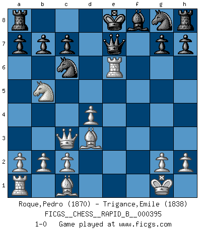 Last move : 1-0 2024 April 26 10:44:41 [Event "FICGS__CHESS__RAPID_B__000395"] [Site "FICGS"] [Date "2024.01.28"] [Round "1"] [White "Roque,Pedro"] [Black "Trigance,Emile"] [Result "1-0"] [WhiteElo "1870"] [BlackElo "1838"] 1.e4 e5 2.Nf3 f5 3.Nxe5 Qf6 4.d4 d6 5.Nc4 fxe4 6.Nc3 Qg6 7.f3 exf3 8.Qxf3 Nc6 9.Nb5 Bg4 10.Qc3 Qe4+ 11.Ne3 d5 12.Bd3 Qe7 13.O-O Be6 14.Nxd5 Bxd5 15.Re1 Be6 16.Rxe6 1-0 Follow this game move after move (download)I believe that Chess possesses a magic that is also a help in advanced age. A rheumatic knee is forgotten during a game of Chess and other events can seem quite unimportant in comparison with a catastrophe on the chessboard. (Vlastimil Hort) Vielleicht wirkt die Aura früherer Spieler glanzvoller als die der heutigen Spieler, aber das liegt daran, dass man kein Programm wie Fritz hatte, das einem all die Löcher in ihren Partien zeigt. (Vladimir Kramnik) Aunque la mayoría de la gente disfruta observar las partidas de los grandes Maestros de ataque, algunos de los jugadores mas notables en la historia han sido los jugadores silenciosos posicionales. Lentamente ellos te aplastan despojandote de tu espacio, congestionando tus piezas y dejandote virtualmente sin nada que hacer. (Yasser Seirawan) C'est la seule position que je connaisse où les deux camps sont mals. Propos prêtés à V. Anand. I would love to change the world, but they won't give me the source code. (Unknown)