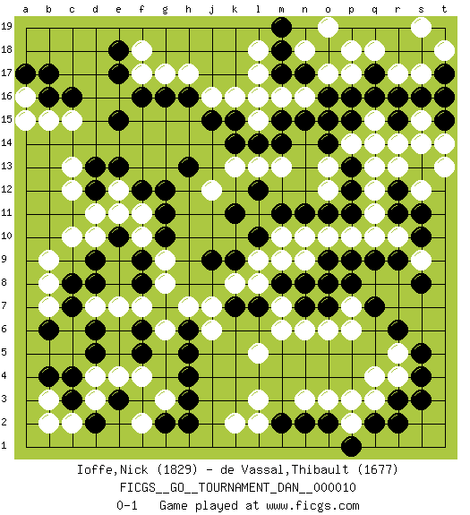 Last move : 0-1 2008 March 20 19:21:31 [Event "FICGS__GO__TOURNAMENT_DAN__000010"] [Site "FICGS"] [Date "2007.09.12"] [Round "1"] [Black "Ioffe,Nick"] [White "de Vassal,Thibault"] [Result "0-1"] [Rating 1 "1829"] [Rating 2 "1677"] 1.q16 d3 2.c16 q4 3.d5 f4 4.c3 c2 5.c4 c10 6.c8 c13 7.e17 l17 8.h3 g3 9.h4 b3 10.b4 b2 11.r6 p6 12.r3 r4 13.s4 q3 14.s3 l3 15.h6 l5 16.q9 r14 17.r12 p14 18.s16 o17 19.o16 p17 20.p16 h17 21.m15 o13 22.o11 m13 23.k15 k16 24.j15 k13 25.h13 s15 26.q17 q18 27.n17 n18 28.o18 p18 29.m18 o19 30.m17 l18 31.m19 r17 32.r16 s17 33.t17 t18 34.t16 l15 35.l14 l16 36.m14 n16 37.n15 m16 38.o14 q12 39.r11 o12 40.n11 l13 41.k14 j12 42.g11 b15 43.b16 c15 44.e15 r13 45.k11 s12 46.s11 t13 47.r15 s14 48.t15 t14 49.q14 q13 50.p15 q15 51.o15 q14 52.p12 q11 53.p11 r10 54.s10 s9 55.r9 q10 56.s8 p10 57.p9 o10 58.n8 n10 59.m11 m9 60.l7 l11 61.l10 l9 62.k9 m7 63.m8 l8 64.k7 o8 65.o9 n9 66.n7 m6 67.o7 k8 68.j9 j7 69.p13 j6 70.f6 p7 71.p8 b9 72.e3 e4 73.g2 f2 74.h2 b8 75.c7 o6 76.q7 h7 77.f5 b7 78.b6 f18 79.e18 f17 80.f16 a16 81.a17 a15 82.b17 e11 83.h16 j16 84.g16 g17 85.e13 e12 86.f12 f7 87.f8 e7 88.d6 g8 89.f9 d7 90.d9 g9 91.g10 k2 92.q2 p2 93.r2 f10 94.e10 f11 95.d8 d10 96.d12 d11 97.d13 c12 98.g12 g6 99.d2 d4 100.h5 r5 101.s5 m10 102.l12 n6 103.o8 s19 104.o2 o3 105.p1 p3 106.n2 n3 107.m2 l2 0-1 Here are the names of the openings (joseki) played in the four corners : Corner d4 : d3 d5 Komoku (Somok, Xiao~mu`) 3-4 Point. The komoku (3-4) point is the traditional corner enclosure move.. Ikken Takagakari (Hankan Nop'dakeolch'im, Yi Gaogua`jiao~, 1-Space High Approach). The 5-4 approach move has become more popular in modern times, as modern Go emphasizes speed and influence. Corner d16 : c16 c13 Komoku (Somok, Xiao~mu`) 3-4 Point. The komoku (3-4) point is the traditional corner enclosure move.. Corner q16 : q16 l17 Hoshi (Hwajeom, Seongjeom, Xingwei`) 4-4 Point. The star or hoshi (4-4) point, emphasizing influence at the potential expense of territory. Corner q4 : q4 r6 Hoshi (Hwajeom, Seongjeom, Xingwei`) 4-4 Point. The star or hoshi (4-4) point, emphasizing influence at the potential expense of territory. Ikken Kakari (Hankan Keolch'im, Yi Gua`jiao~, 1-Space Low Approach). Black 2 is the standard approach move to the 4-4. Player White won this Go (weiqi, baduk) game. Follow this game move after move (download)Don't count territory held by only one eye. (Anonymous) You have to believe in yourself. (Sun Tzu)