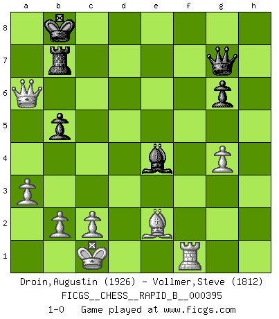 Last move : 1-0 2024 March 24 10:27:19 [Event "FICGS__CHESS__RAPID_B__000395"] [Site "FICGS"] [Date "2024.01.28"] [Round "1"] [White "Droin,Augustin"] [Black "Vollmer,Steve"] [Result "1-0"] [WhiteElo "1926"] [BlackElo "1812"] 1.e4 c5 2.Nf3 d6 3.d4 cxd4 4.Nxd4 Nf6 5.Nc3 g6 6.Be3 Bg7 7.f3 Nc6 8.Qd2 a6 9.g4 Nxd4 10.Bxd4 b5 11.h4 e5 12.Be3 Bb7 13.h5 h6 14.hxg6 fxg6 15.Bxh6 Qe7 16.O-O-O O-O-O 17.Be2 d5 18.Bxg7 Rxh1 19.Rxh1 Qxg7 20.exd5 Nxd5 21.Nxd5 Rxd5 22.Qc3+ Kb8 23.a3 Rd7 24.Qc5 e4 25.fxe4 Bxe4 26.Rf1 Rc7 27.Qb6+ Rb7 28.Qxa6 1-0 Follow this game move after move (download)Chess is a matter of delicate judgment, knowing when to punch and how to duck. (Bobby Fischer) Nie in meinem Leben habe ich die französische Verteidigung gespielt, welche die Stumpfsinnigste von allen ist. (Wilhelm Steinitz) El Ajedrez es un juego terrible. Si no dominas el centro, tu oponente tiene una posición mas libre. Si tu tienes el centro, entonces realmente tienes algo de que preocuparte. (Siegbert Tarrasch) Je menace de comprendre la position. (Anonyme) Faith : not wanting to know what is true. (Friedrich Nietzsche)