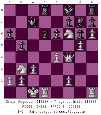 Last move : 1-0 2024 May 17 11:30:9 [Event "FICGS__CHESS__RAPID_B__000395"] [Site "FICGS"] [Date "2024.01.28"] [Round "1"] [White "Droin,Augustin"] [Black "Trigance,Emile"] [Result "1-0"] [WhiteElo "1926"] [BlackElo "1838"] 1.e4 c5 2.Nf3 d6 3.d4 cxd4 4.Nxd4 Nf6 5.Nc3 a6 6.Nb3 g6 7.Be2 Bg7 8.g4 b5 9.g5 Ng4 10.Bxg4 Bxg4 11.Qxg4 Nc6 12.Be3 Ne5 13.Qe2 Nc4 14.O-O-O Nxe3 15.Qxe3 Qc7 16.Nd5 Qd8 17.h4 Rc8 18.h5 e6 19.Nf6+ Kf8 20.Qf4 Qc7 21.c3 Rd8 22.h6 1-0 Follow this game move after move (download)If your opponent cannot do anything active, then don't rush the position; instead you should let him sit there, suffer, and beg you for a draw. (Jeremy Silman) Meine Liebe ist Schach, Schach, Schach. Ich muss jeden Tag Schach spielen, deshalb fühle ich mich so stark. (Miguel Najdorf) El Ajedrez es el juego mas altamente simbólico, pero las agresiones estan por lo tanto aún mas francamente representadas en la partida. Tal vez comenzo como un juego de guerra; Algo como la representación de una batalla en miniatura entre las fuerzas de dos reinos. (Karl Meninger) La guerre est enfant de la passion, la passion est enfant du narcissisme et le narcissisme est l'enfant. (...) Une autre partie ? (Thibault de Vassal) It's not enough to succeed. Others must fail. (Gore Vidal)