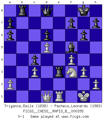 Last move : 0-1 2024 April 25 18:39:38 [Event "FICGS__CHESS__RAPID_B__000395"] [Site "FICGS"] [Date "2024.01.28"] [Round "1"] [White "Trigance,Emile"] [Black "Pacheco,Leonardo"] [Result "0-1"] [WhiteElo "1838"] [BlackElo "1983"] 1.d4 Nf6 2.c4 c5 3.d5 e6 4.Nc3 exd5 5.cxd5 d6 6.e4 g6 7.f4 Bg7 8.Bb5+ Nfd7 9.Bd3 Qh4+ 10.g3 Qd8 11.Nf3 O-O 12.O-O Re8 13.Qc2 Na6 14.Bxa6 bxa6 15.Bd2 Rb8 16.Kh1 c4 17.Be3 Bxc3 18.bxc3 Nf6 19.Nd2 Nxe4 20.Rae1 Bh3 21.Rf3 Bf5 22.Kg1 Ng5 23.Qd1 Nxf3+ 24.Nxf3 Rxe3 0-1 Follow this game move after move (download)I'm not afraid of Spassky. The world knows I'm the best. You don't need a match to prove it. (Bobby Fischer) Zeige mir drei Eröffnungsvarianten und ich beweise dir, dass zwei davon inkorrekt sind. (Emanuel Lasker) Después de una mala apertura, hay una esperanza en el juego medio. Pero una vez que estas en finales, el momento de la verdad ha llegado. (Edmar Mednis) Avant la finale, les dieux ont créé le milieu de partie. (Tarrasch) There will be no order, only chaos. (Sol Robeson in Pi by Darren Aronofsky)