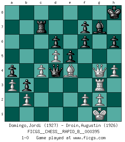 Last move : 1-0 2024 February 8 23:6:26 [Event "FICGS__CHESS__RAPID_B__000395"] [Site "FICGS"] [Date "2024.01.28"] [Round "1"] [White "Domingo,Jordi"] [Black "Droin,Augustin"] [Result "1-0"] [WhiteElo "1927"] [BlackElo "1926"] 1.e4 c5 2.Nf3 Nc6 3.d4 cxd4 4.Nxd4 Nf6 5.Nc3 e5 6.Ndb5 d6 7.Bg5 a6 8.Na3 b5 9.Bxf6 gxf6 10.Nd5 Be6 11.c3 Bg7 12.Nc2 Ne7 13.Nce3 Nxd5 14.Nxd5 O-O 15.Ne3 Qb6 16.Be2 Rfd8 17.O-O Qb7 18.Bg4 Kh8 19.Qf3 a5 20.Bf5 b4 21.c4 a4 22.Rfd1 b3 23.a3 Rac8 24.Rac1 Rc5 25.Rc3 Qe7 26.Qh5 h6 27.Nd5 Bxd5 28.exd5 Rg8 29.Re1 Bf8 30.h4 Qa7 31.Re4 Rc7 32.Rg4 Rxg4 33.Qxg4 Qd4 34.Be4 Bg7 35.Rg3 1-0 Follow this game move after move (download)You need not play well - just help your opponent to play badly. (Genrikh Chepukaitis) Ich glaube, ich kenne inzwischen die Gründe für mein Versagen: schachliche Charakterfehler. Ich war nie ein Wunderkind und in meiner gesamten menschlichen Entwicklung immer zu langsam. (Viktor Kortschnoi) Fischer es el jugador mas fuerte del mundo. De hecho, el jugador mas fuerte que jamas haya existido. (Larry Evans) Le profane ne songe pas à la somme de jouissance dont il se prive, qui méconnaît ce jeu aux ressources aussi variées que passionnantes. (Jean-Marie Jeanton-Lamarche) Two beer, or not two beer. (Unknown)
