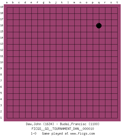Last move : 1-0 2007 October 13 18:35:11 [Event "FICGS__GO__TOURNAMENT_DAN__000010"] [Site "FICGS"] [Date "2007.09.12"] [Round "1"] [Black "Dew,John"] [White "Budai,Francisc"] [Result "1-0"] [Rating 1 "1634"] [Rating 2 "1100"] 1.q16 1-0 This go game has been lost on time (started : 2007.09.12 22:50:50) Here are the names of the openings (joseki) played in the four corners : Player Black won this Go (weiqi, baduk) game. Follow this game move after move (download)There are possible things, impossible things, and things that happen. Sometimes things happen that were impossible. (Pierre Audouard) The meaning of life is that it is to be lived, and it is not to be traded and conceptualized and squeezed into a pattern of systems. (Bruce Lee)