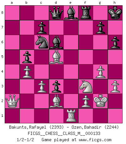 Last move : 1/2-1/2 2024 June 6 19:7:45 [Event "FICGS__CHESS__CLASS_M__000133"] [Site "FICGS"] [Date "2024.01.30"] [Round "1"] [White "Bakunts,Rafayel"] [Black "Ozen,Bahadir"] [Result "1/2-1/2"] [WhiteElo "2393"] [BlackElo "2244"] 1.e4 e5 2.Nf3 Nc6 3.Bb5 a6 4.Ba4 Nf6 5.O-O Nxe4 6.d4 b5 7.Bb3 d5 8.dxe5 Be6 9.Nbd2 Nc5 10.c3 Be7 11.Bc2 d4 12.Nb3 d3 13.Bb1 Nxb3 14.axb3 Bf5 15.b4 O-O 16.Re1 Qd7 17.Bf4 Rfd8 18.Ba2 Be6 19.Bb1 Bf5 20.h3 a5 21.g4 Bg6 22.bxa5 Rxa5 23.Ba2 Rf8 24.e6 Qd8 25.exf7+ Kh8 26.b4 Ra4 27.Bd2 h6 28.Be6 Rxa1 29.Qxa1 Bxf7 30.Qa2 Be8 31.Bf5 Bf7 32.Be6 Be8 33.Kg2 Bd6 34.Bd5 1/2-1/2 Follow this game move after move (download)Chess is a terrible game. If you have no center, your opponent has a freer position. If you do have a center, then you really have something to worry about ! (Siegbert Tarrasch) Mein Name ist Rustam Kamsky. Sie haben meinen Sohn belästigt. Bereiten Sie sich aufs Sterben vor. (Rustam Kamsky) Me gusta decir que Bobby Fischer fue el mejor jugador que jamás haya existido. Pero lo que hizo de Fischer un genio, fue su habilidad de mezclar una frescura y pragmatismo Americano con ideas Rusas acerca de la estrategia. (Bruce Pandolfini) Je crois qu'il existe des manières très spécifiques de jouer efficacement contre une machine. Evidemment, nous n'avons aucune chance en technique pure, parce que l'ordinateur calcule de manière parfaite. Mais lorsque nous faisons appel à notre cerveau, en utilisant l'intuition et la compréhension, alors nous restons beaucoup plus forts. (Anatoli Karpov) In theory there is no difference between theory and practice. In practice there is. (Yogi Berra)