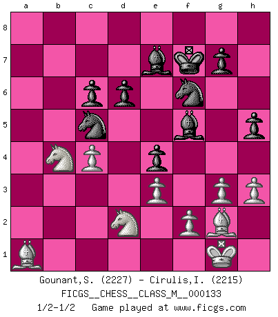 Last move : 1/2-1/2 2024 February 15 23:19:10 [Event "FICGS__CHESS__CLASS_M__000133"] [Site "FICGS"] [Date "2024.01.30"] [Round "1"] [White "Gounant,Stanislas"] [Black "Cirulis,Ilmars"] [Result "1/2-1/2"] [WhiteElo "2227"] [BlackElo "2215"] 1.c4 e5 2.d3 f5 3.Nc3 Nf6 4.Nf3 Nc6 5.g3 Be7 6.Bg2 a5 7.O-O d6 8.a3 O-O 9.Rb1 Qe8 10.b4 axb4 11.axb4 Qh5 12.b5 Nd8 13.Rb4 Ne6 14.Ra4 Bd7 15.Rxa8 Rxa8 16.e3 Nc5 17.Bb2 e4 18.dxe4 fxe4 19.Nd2 Qxd1 20.Rxd1 Bf5 21.h3 h5 22.Ra1 Rxa1+ 23.Bxa1 Kf7 24.Na2 c6 25.bxc6 bxc6 26.Nb4 1/2-1/2 Follow this game move after move (download)Winning isn't everything... but losing is nothing. (Mednis) Die Neutralität betrachte ich als eine schwere Krankheit. (Viktor Kortschnoi) Bobby solo arroja las piezas y solas caen en las casillas correctas. (Miguel Najdorf ) Si le désir cupide (et stupide) de gagner est une inépuisable source de souffrance, une combinaison brillante sur l'échiquier est une découverte : le coquelicot qui s'épanouit lorsque apparaît la Voie Lactée. (Arrabal) Luck never gives; it only lends. (Swedish proverb)