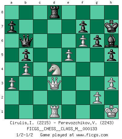 Last move : 1/2-1/2 2024 March 1 12:32:37 [Event "FICGS__CHESS__CLASS_M__000133"] [Site "FICGS"] [Date "2024.01.30"] [Round "1"] [White "Cirulis,Ilmars"] [Black "Perevozchikov,Vjacheslav"] [Result "1/2-1/2"] [WhiteElo "2215"] [BlackElo "2243"] 1.e4 e6 2.d4 d5 3.e5 c5 4.c3 Nc6 5.Nf3 Qb6 6.a3 Bd7 7.b4 cxd4 8.cxd4 Rc8 9.Bb2 Na5 10.Nbd2 Nc4 11.Nxc4 dxc4 12.Rc1 Qa6 13.d5 exd5 14.Qxd5 Ne7 15.Qd2 b5 16.Be2 Be6 17.Nd4 g6 18.O-O h5 19.Rcd1 Bh6 20.Qe1 Bd5 21.f4 Qb7 22.Rf2 O-O 23.f5 Be4 24.f6 Nd5 25.Bf3 Bxf3 26.Rxf3 Qb6 27.Kh1 c3 28.Bxc3 Rxc3 29.Rxc3 Nxc3 30.Qxc3 Rd8 31.Qd3 Kh7 32.h3 1/2-1/2 Follow this game move after move (download)A strong memory, concentration, imagination, and a strong will is required to become a great Chess player. (Bobby Fischer) Frage: Was machen Sie mit den Preisen? Anwort: Ich habe Angst, dass meine Freundin davon neue Kleider kauft. (Loek van Wely) Aunque la mayoría de la gente disfruta observar las partidas de los grandes Maestros de ataque, algunos de los jugadores mas notables en la historia han sido los jugadores silenciosos posicionales. Lentamente ellos te aplastan despojandote de tu espacio, congestionando tus piezas y dejandote virtualmente sin nada que hacer. (Yasser Seirawan) Mais n'est-ce pas déjà le limiter injurieusement que d'appeler les échecs un jeu? N'est-ce pas aussi une science, un art, ou quelque chose qui, comme le cercueil de Mahomet entre ciel et terre, est suspendu entre l'un et l'autre, et qui réunit un nombre incroyable de contraires ? (Stefan Zweig) The bottom line is always the bottom line. (Johann Piek)