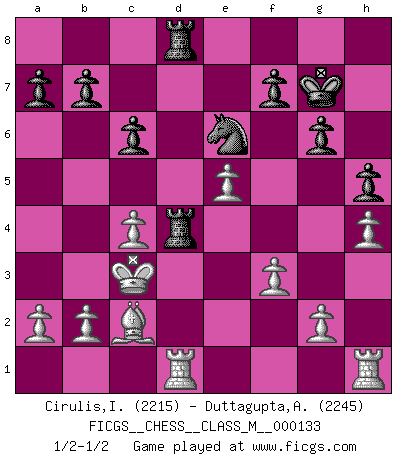 Last move : 1/2-1/2 2024 May 2 11:13:8 [Event "FICGS__CHESS__CLASS_M__000133"] [Site "FICGS"] [Date "2024.01.30"] [Round "1"] [White "Cirulis,Ilmars"] [Black "Duttagupta,Aniruddha"] [Result "1/2-1/2"] [WhiteElo "2215"] [BlackElo "2245"] 1.e4 d5 2.exd5 Qxd5 3.Nc3 Qd8 4.Nf3 Nf6 5.d4 g6 6.Bg5 Bg7 7.Qd2 O-O 8.Bh6 c6 9.h4 Bg4 10.Bxg7 Kxg7 11.Ne5 h5 12.f3 Be6 13.Qe3 Nd5 14.Nxd5 Qxd5 15.Nd3 Rd8 16.c3 Nd7 17.Nf4 Qd6 18.Bd3 Bd5 19.c4 Qb4+ 20.Qd2 Qxd2+ 21.Kxd2 e5 22.dxe5 Be6 23.Rae1 Nc5 24.Kc3 Na4+ 25.Kc2 Nc5 26.Rd1 Rd4 27.Nxe6+ Nxe6 28.Kc3 Rad8 29.Bc2 1/2-1/2 Follow this game move after move (download)I'm not a materialistic person, in that, I don't suffer the lack or loss of money. The absence of worldly goods I don't look back on. For Chess is a way I can be as materialistic as I want without having to sell my soul. (Jamie Walter Adams) Kein Großmeister ist normal. Sie unterscheiden sich nur im Ausmaß Ihrer Verrücktheit. (Viktor Kortschnoi) No volvere nunca a jugar contigo. Has insultado a mi amigo. - cuando un oponente se maldijo por una mala jugada (Miguel Najdorf) Les écrivains ont utilisé les échecs pour analyser les côtés extrêmes de la nature humaine. Dans ce cadre, les échecs offrent un champ d'expérimentation idéal. Mais on pourrait faire la même chose avec la peinture. Et là, en vous référant à Van Gogh, vous ne tirerez pas de conclusion définitive sur les peintres. (Gary Kasparov) Life is like a game of cards: the hand you are dealt represents determinism; the way you play it is free will. (Jawaharlal Nehru)