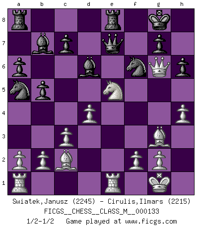 Last move : 1/2-1/2 2024 March 31 17:34:16 [Event "FICGS__CHESS__CLASS_M__000133"] [Site "FICGS"] [Date "2024.01.30"] [Round "1"] [White "Swiatek,Janusz"] [Black "Cirulis,Ilmars"] [Result "1/2-1/2"] [WhiteElo "2245"] [BlackElo "2215"] 1.e4 e5 2.Nf3 Nc6 3.Bb5 a6 4.Ba4 b5 5.Bb3 Bb7 6.O-O Nf6 7.Re1 Bc5 8.d3 h6 9.c3 O-O 10.Nbd2 Re8 11.Nf1 Bf8 12.d4 Na5 13.Bc2 d5 14.Nxe5 dxe4 15.Bf4 Bd6 16.Nd2 Nd5 17.Bg3 f5 18.Qe2 Qg5 19.h4 Qe7 20.Nxe4 fxe4 21.Qxe4 Nf6 22.Qg6 1/2-1/2 Follow this game move after move (download)Fischer is an American Chess tragedy on par with Morphy and Pillsbury. (Mig Greengard) Je älter ich werde, um so mehr schätze ich die Bauern. (Paul Keres) Cuando la partida de Ajedrez termina, el Peón y el Rey regresan a la misma caja. (Irish saying) Il a essayé de se convaincre qu'il pourrait empêcher toutes les erreurs et ne jamais perdre. L'horreur ! Gary Kasparov au sujet de Robert Fischer. Wisdom doesn't necessarily come with age. Sometimes age just shows up all by itself. (Tom Wilson)