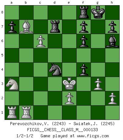 Last move : 1/2-1/2 2024 April 16 19:25:21 [Event "FICGS__CHESS__CLASS_M__000133"] [Site "FICGS"] [Date "2024.01.30"] [Round "1"] [White "Perevozchikov,Vjacheslav"] [Black "Swiatek,Janusz"] [Result "1/2-1/2"] [WhiteElo "2243"] [BlackElo "2245"] 1.Nf3 d5 2.c4 d4 3.b4 c5 4.Bb2 Nf6 5.g3 cxb4 6.a3 bxa3 7.Bxd4 Nc6 8.Bxf6 gxf6 9.Nxa3 Bg7 10.d4 Qa5+ 11.Qd2 Qxd2+ 12.Kxd2 Bg4 13.Bg2 Bxf3 14.Bxf3 Nxd4 15.Bxb7 Rd8 16.Ke3 O-O 17.Rhb1 Rd7 18.c5 e5 19.c6 Bh6+ 20.f4 exf4+ 1/2-1/2 Follow this game move after move (download)Via the squares on the chessboard, the Indians explain the movement of time and the age, the higher influences which control the world and the ties which link Chess with the human soul. (Al-Masudi) Schach ist die gewalttätigste aller Sportarten. (Garry Kasparov) Yo no creo en la psicología. Yo creo en las buenas movidas. (Bobby Fischer) Les Echecs représentent une sphère d'idées créatrices basée sur la volonté des deux protagonistes. (Smyslov) No enterprise is more likely to succeed than one concealed from the enemy until it is ripe for execution. (Niccolo Machiavelli)