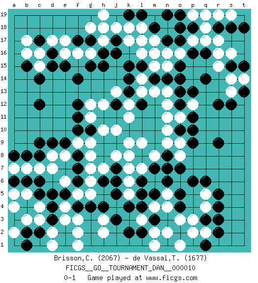 Last move : 0-1 2008 April 14 18:13:33 [Event "FICGS__GO__TOURNAMENT_DAN__000010"] [Site "FICGS"] [Date "2007.09.12"] [Round "1"] [Black "Brisson,Claude"] [White "de Vassal,Thibault"] [Result "0-1"] [Rating 1 "2067"] [Rating 2 "1677"] 1.q16 c4 2.q3 d17 3.r9 e3 4.c12 c15 5.c9 l17 6.o17 h17 7.k4 h3 8.j3 q5 9.r5 q4 10.r4 p3 11.r3 n4 12.h4 h2 13.e5 c7 14.c5 b5 15.d4 c3 16.d3 d2 17.c2 d1 18.b4 b3 19.b6 a4 20.c6 d8 21.d9 e8 22.g10 g8 23.h9 b7 24.a6 h7 25.j7 f5 26.e2 e4 27.d5 f2 28.f4 f3 29.f6 g5 30.h6 g6 31.f7 g7 32.n6 q2 33.r2 p2 34.q6 l3 35.l15 n11 36.h15 p12 37.r12 n13 38.l12 n9 39.o10 n10 40.p13 o8 41.p9 o6 42.o5 n5 43.o7 n7 44.p6 m6 45.m7 o6 46.b2 a2 47.n6 n15 48.m16 o6 49.b1 a5 50.n6 n16 51.n17 o6 52.e1 f1 53.n6 m8 54.n8 l7 55.n7 l9 56.l6 k6 57.m5 k7 58.j6 j8 59.h8 k5 60.j5 m4 61.g4 g9 62.l4 h10 63.j9 k8 64.l5 j10 65.f10 g16 66.j17 j18 67.l2 m2 68.k2 n2 69.o4 o3 70.j16 k17 71.f14 h12 72.m3 o1 73.q1 m1 74.e15 e16 75.c14 g12 76.b15 b16 77.d15 c16 78.o12 n12 79.o13 l14 80.k14 l13 81.k13 k12 82.m14 m13 83.n14 m15 84.o14 l16 85.k15 m17 86.f8 f9 87.e9 k9 88.b8 a7 89.c8 d7 90.a8 e6 91.j12 k11 92.f12 j13 93.g15 g11 94.f11 o11 95.p11 o9 96.p10 r17 97.s18 r16 98.r18 q17 99.p16 q18 100.s15 s16 101.p18 p17 102.o19 o16 103.o15 m16 104.m18 n18 105.o18 l18 106.n19 r15 107.q14 s14 108.q19 r19 109.t18 s19 110.h18 g18 111.l19 h19 112.k19 k18 113.t15 p19 114.f17 f16 115.q19 s13 116.s12 p19 117.g17 q19 118.h16 h18 119.t13 t14 120.d16 e17 121.c17 b17 0-1 Here are the names of the openings (joseki) played in the four corners : Corner d16 : d17 c12 Komoku (Somok, Xiao~mu`) 3-4 Point. The komoku (3-4) point is the traditional corner enclosure move.. Corner q16 : q16 l17 Hoshi (Hwajeom, Seongjeom, Xingwei`) 4-4 Point. The star or hoshi (4-4) point, emphasizing influence at the potential expense of territory. Player White won this Go (weiqi, baduk) game. Follow this game move after move (download)Don't count territory held by only one eye. (Anonymous) The various flowers seem good to different people. (Chinese proverb)