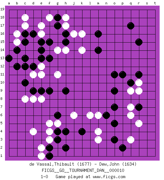 Last move : 1-0 2008 January 10 11:1:28 [Event "FICGS__GO__TOURNAMENT_DAN__000010 "] [Site "FICGS"] [Date "2007.09.12"] [Round "1"] [Black "de Vassal,Thibault "] [White "Dew,John "] [Result "1-0"] [Rating 1 "1677"] [Rating 2 "1634"] 1.q17 r5 2.c16 d4 3.r15 e16 4.h16 d14 5.e15 d15 6.d16 e17 7.f15 c18 8.b14 b13 9.c13 b15 10.b12 c14 11.a13 b16 12.q10 k16 13.r7 q3 14.m16 h17 15.f13 d13 16.d12 e12 17.e13 d11 18.c12 e11 19.k4 m4 20.g4 f3 21.g3 f4 22.f2 e2 23.f1 e1 24.h2 f5 25.c10 c8 26.g17 h18 27.g18 j16 28.h15 k14 29.m14 h14 30.c15 c17 31.e14 f18 32.o11 r10 33.r11 q9 34.p11 q7 35.o3 m3 36.o5 m6 37.o7 q6 38.n6 l6 39.o9 r9 40.p2 j6 41.d9 d8 42.e9 e8 43.f9 g11 44.h9 g14 45.g6 g5 46.h4 1-0 This go game has been lost on time (started : 2007.09.12 22:50:50) Here are the names of the openings (joseki) played in the four corners : Corner d16 : c16 e16Komoku (Somok, Xiao~mu`) 3-4 Point. The komoku (3-4) point is the traditional corner enclosure move..Ikken Takagakari (Hankan Nop'dakeolch'im, Yi Gaogua`jiao~, 1-Space High Approach). The 5-4 approach move has become more popular in modern times, as modern Go emphasizes speed and influence. Corner q4 : r5 r7Mokuhazushi (Waemok, Wai`mu`) 5-3 Point. The mokuhazushi (5-3) point was popular in the Edo period in Japan (1600 - 1867). It emphasizes influence; territorially, it is inferior to the 3-4 point. Corner d4 : d4 g4Hoshi (Hwajeom, Seongjeom, Xingwei`) 4-4 Point. The star or hoshi (4-4) point, emphasizing influence at the potential expense of territory.Nikken Takagakari (Dukan Nop'dakeolch'im, E`r Gaojia, 2-Space High Approach). Black 2 is a light approach move. Rarely played in even games, Black 2 is typically employed in handicap games. White continues with 6-4 or 3-10. In Korean Sunjang Baduk White has a stone on 8-4. Player Black won this Go (weiqi, baduk) game.Follow this game move after move (download ) The poor player plays the opponent's game for him. (Anonymous) No, I am still playing. (Anatoly Karpov)