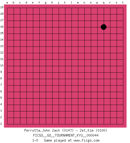 Last move : 1-0 2007 October 20 19:33:19 [Event "FICGS__GO__TOURNAMENT_KYU__000044"] [Site "FICGS"] [Date "2007.09.13"] [Round "1"] [Black "Perrotta,John Zach"] [White "Zet,Kim"] [Result "1-0"] [Rating 1 "0147"] [Rating 2 "0100"] 1.q16 1-0 This go game has been lost on time (started : 2007.09.13 13:31:26) Here are the names of the openings (joseki) played in the four corners : Player Black won this Go (weiqi, baduk) game. Follow this game move after move (download)There is no territory in the centre. (Anonymous) A computer lets you make more mistakes faster than any invention in human history - with the possible exceptions of handguns and tequila. (Mitch Ratcliffe)
