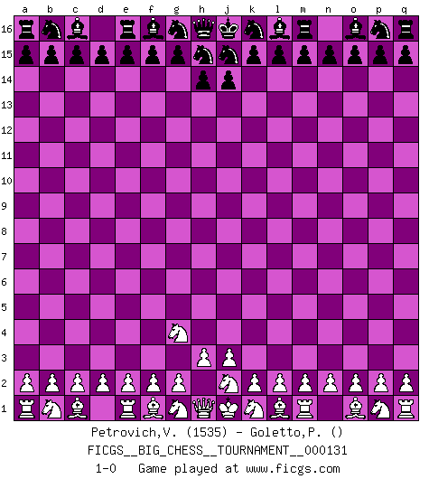 Last move : 1-0 2024 March 16 13:35:58 [Event "FICGS__BIG_CHESS__TOURNAMENT__000131"] [Site "FICGS"] [Date "2024.02.15"] [Round "1"] [White "Petrovich,Valery"] [Black "Goletto,Piero Giuseppe"] [Result "1-0"] [WhiteElo "1535"] [BlackElo ""] 1.h2-g4 1-0 This big chess game has been lost on time (started : 2024.02.15 0:47:21) Follow this game move after move (download)My style is somewhere between that of Tal and Petrosian. (Reshevsky) Charakterschwächen offenbaren sich normalerweise während einer Schachpartie. (Garry Kasparov) Las combinaciones han sido siempre el aspecto más intrigante del Ajedrez. Los Maestros las buscan, el público las aplauden, los críticos las alaban. La razón se debe a que las combinaciones hacen posible que el Ajedrez sea más que un ejercicio matemático con una carencia de vida. Ellas son la poesía del juego, son del Ajedrez lo que la melodía es de la música. Ellas representan el triunfo de la mente sobre la materia. (Reuben Fine) Si je n'étais pas joueur d'échecs, je serais le meilleur dans quelque chose d'autre. (Anatoli Karpov) Information on the Internet is subject to the same rules and regulations as conversation at a bar. (George Lundberg)