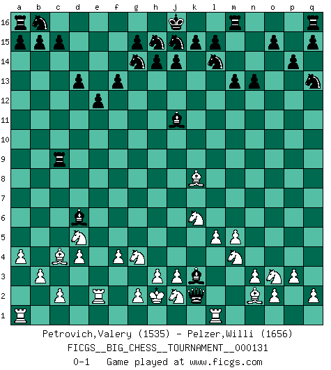 Last move : 0-1 2024 June 12 16:41:28 [Event "FICGS__BIG_CHESS__TOURNAMENT__000131"] [Site "FICGS"] [Date "2024.02.15"] [Round "1"] [White "Petrovich,Valery"] [Black "Pelzer,Willi"] [Result "0-1"] [WhiteElo "1535"] [BlackElo "1656"] 1.h2-g4 m15-m13 2.j2-k4 e15-e13 3.h1-o7 j15-g14 4.m2-m4 k16-l14 5.l1-q6 h16-l13 6.l2-l4 l13-d6 7.k1-h2 d6-q6 8.p1-o3 d15-d13 9.e2-e4 c16-n6 10.o7-l7 f16-d14 11.m4-m5 n6-d15 12.d2-d4 e13-e12 13.l7-p11 n15-n13 14.c1-h6 p16-o14 15.f1-b5 o14-q13 16.p11-j5 g16-j15 17.n2-n3 o16-h10 18.o1-n2 e16-e13 19.m1-m4 e13-j13 20.j5-f5 f15-f13 21.b1-c3 q6-o8 22.g1-j2 l16-o13 23.f5-b9 d15-c14 24.h2-j4 j13-j9 25.b9-f5 o13-f5 26.e4-f5 o8-o14 27.j1-h2 o14-p14 28.p2-p3 p14-f5 29.e1-e2 h10-b4 30.b5-d3 f5-c8 31.c3-d5 b4-n15 32.j2-g3 c14-a12 33.q1-e1 n15-d6 34.f2-f4 d14-c13 35.m4-q4 p15-p14 36.k4-l6 c13-e15 37.q4-q7 c8-b8 38.b2-b3 e15-j11 39.l4-l5 b8-l8 40.j4-k6 l8-l12 41.d3-c4 l12-q7 42.h6-k8 j9-c9 43.a2-a4 q7-l2 44.l6-m4 l2-k2 45.g3-j2 a12-l2 46.e1-l1 l2-k3 0-1 This big chess game has been lost on time (started : 2024.02.15 0:47:21) Follow this game move after move (download)If cunning alone were needed to excel, women would be the best Chess players. (Albin) Am wohlsten fühle ich mich, wenn ich sehe, wie sich mein Gegner im Todeskampf windet. (Robert James Fischer) Un entendimiento minucioso de las típicas continuaciones de mate hacen de las mas complicadas combinaciones de sacrificio que conducen hacia ellas no solo no dificiles, sino casi un asunto de rutina. (Siegbert Tarrasch) On est toujours la mazette de quelqu'un d'autre. (Anonyme) Luck is what you have left over after you give 100 percent. (Langston Coleman)