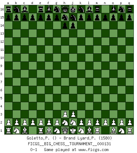 Last move : 0-1 2024 March 16 13:35:58 [Event "FICGS__BIG_CHESS__TOURNAMENT__000131"] [Site "FICGS"] [Date "2024.02.15"] [Round "1"] [White "Goletto,Piero Giuseppe"] [Black "Brand Lyard,Paul"] [Result "0-1"] [WhiteElo ""] [BlackElo "1580"] 0-1 This big chess game has been lost on time (started : 2024.02.15 0:47:21) Follow this game move after move (download)I love all positions. Give me a difficult positional game, I will play it. But totally won positions, I cannot stand them. (Hein Donner) Es macht mich traurig, wenn ich sehe, dass Golfprofis mehr verdienen als Schachsportler. Obwohl ich davon überzeugt bin, dass wir Schachspieler viel härter trainieren müssen als die Golfer. (Alexandra Kosteniuk) Ser exitoso en el Ajedrez te permite descubrir tu propia personalidad. Eso es lo que deseo para los niños de mi clase. (Saudin Robovic) D'abord les bases : Jouez et étudiez, puis étudiez et jouez, ensuite jouez et étudiez, puis étudiez et jouez. Deuxièmement : Donnez toujours le meilleur de vous-même ! (Ken Smith) Treat your password like your toothbrush. Don't let anybody else use it, and get a new one every six months. (Clifford Stoll)