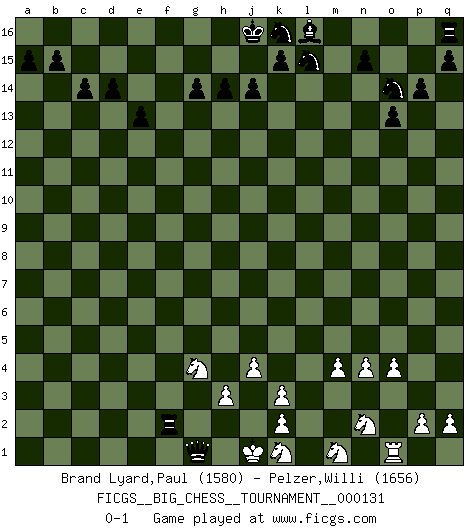 Last move : 0-1 2024 April 22 22:14:18 [Event "FICGS__BIG_CHESS__TOURNAMENT__000131"] [Site "FICGS"] [Date "2024.02.15"] [Round "1"] [White "Brand Lyard,Paul"] [Black "Pelzer,Willi"] [Result "0-1"] [WhiteElo "1580"] [BlackElo "1656"] 1.n2-n4 p15-p14 2.m2-m4 o16-p15 3.b1-c3 m15-m13 4.j2-l3 o15-o13 5.e2-e4 e15-e13 6.d2-d3 j15-k13 7.f1-e2 h16-o10 8.o2-o3 o10-f2 9.e1-f1 f2-c5 10.h1-k3 p15-c3 11.b2-c3 c5-c3 12.a1-b1 c3-c2 13.c1-o12 c2-a2 14.e2-o11 a2-a10 15.o11-m13 m16-m13 16.o1-d11 g15-g14 17.l1-p5 a10-p10 18.o3-o4 p10-o11 19.o12-l15 k13-l15 20.d11-c12 m13-k13 21.c12-f15 k13-k3 22.l2-k3 g16-f14 23.f15-e16 f14-e16 24.b1-b13 b16-c14 25.f1-f15 e16-d14 26.f15-f16 h15-f16 27.b13-c13 o11-d1 28.j1-h1 d1-d3 29.c13-c14 d15-c14 30.p5-e15 c16-p4 31.e15-f16 p4-m1 32.f16-d14 c15-d14 33.l3-m1 d3-e4 34.j3-j4 a16-f16 35.p1-n2 p16-o14 36.q1-o1 f16-f2 37.h2-g4 e4-g2 38.h1-j1 g2-g1 0-1 Follow this game move after move (download)You may learn much more from a game you lose than from a game you win. You will have to lose hundreds of games before becoming a good player. (Jose Raul Capablanca) In der Schule lernt man nichts. Es ist nur Zeitverschwendung. (Robert James Fischer) Vive, pierde y aprende al observar a tu oponente como ganar. (Amber Steenbock) Même un GMI sait rarement calculer sur plus de cinq coups une attaque à sacrifices. (Rudolf Spielmann) I find television to be very educating. Every time somebody turns on the set, I go in the other room and read a book. (Groucho Marx)