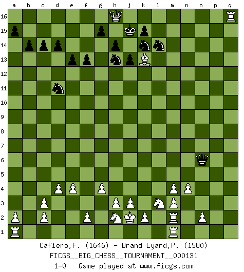 Last move : 1-0 2024 May 4 14:37:6 [Event "FICGS__BIG_CHESS__TOURNAMENT__000131"] [Site "FICGS"] [Date "2024.02.15"] [Round "1"] [White "Cafiero,Florian"] [Black "Brand Lyard,Paul"] [Result "1-0"] [WhiteElo "1646"] [BlackElo "1580"] 1.n2-n4 n15-n13 2.d2-d4 o16-b4 3.b1-c3 b4-c3 4.b2-c3 d15-d14 5.j2-k4 m15-m14 6.h1-o7 f15-f14 7.o7-o15 m16-m15 8.o15-c4 c15-c14 9.e2-e4 j15-h13 10.m2-m4 m15-o15 11.c4-o15 p16-q14 12.o15-p15 q16-p16 13.p15-q14 p16-p11 14.q14-q15 h16-k14 15.p2-p3 l16-n14 16.o1-q3 c16-q3 17.p1-q3 e15-e13 18.q3-o4 k14-k5 19.q15-l15 f16-e15 20.l15-m14 n14-e6 21.g2-g4 f14-f13 22.m14-n13 p11-k11 23.c1-n11 k11-n11 24.n13-n11 e15-p5 25.q2-q4 p5-o4 26.l1-o4 k5-n2 27.m1-m2 n2-o3 28.q1-n1 e6-g8 29.k4-m3 g8-m3 30.l2-m3 e16-e14 31.n11-b11 e14-e15 32.b11-g16 j16-j15 33.g16-b11 b15-b14 34.g1-j2 b16-a14 35.j2-l3 k16-l14 36.n1-p1 a14-c13 37.b11-p11 a16-o16 38.l3-m5 e15-e16 39.k1-l3 l14-k12 40.f1-b5 o16-o7 41.j1-j2 e16-o16 42.o4-n3 o16-o11 43.p11-p9 h15-k14 44.m5-o4 o7-o4 45.p3-o4 o11-o4 46.n3-o4 o3-o4 47.e1-m1 o4-q4 48.p9-p16 c13-d11 49.p1-q1 q4-o6 50.q1-q16 j14-j13 51.b5-k13 k12-l14 52.p16-h16 1-0 Follow this game move after move (download)Winning isn't everything... but losing is nothing. (Mednis) Besser ein falscher Plan, logisch durchgeführt, als gar kein Plan. (Viktor Kortschnoi) Tu no necesitas jugar muy bien, únicamente ayudar a tu oponenet a que juegue muy mal. (Genrikh Chepukaitis) Je ne crois pas en la psychologie, je crois aux bons coups. (Robert Fischer) We need strong personalities and only one world champion to attract sponsors. (Anatoly Karpov)