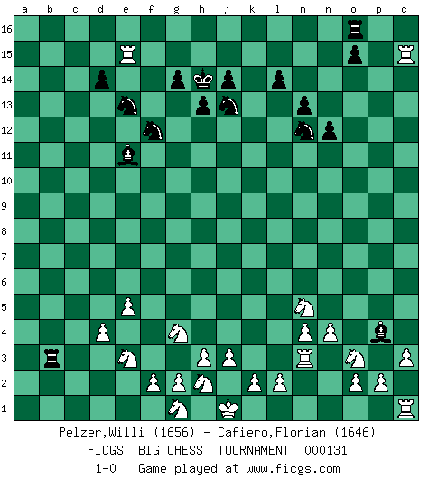 Last move : 1-0 2024 July 10 0:13:48 [Event "FICGS__BIG_CHESS__TOURNAMENT__000131"] [Site "FICGS"] [Date "2024.02.15"] [Round "1"] [White "Pelzer,Willi"] [Black "Cafiero,Florian"] [Result "1-0"] [WhiteElo "1656"] [BlackElo "1646"] 1.m2-m4 j15-k13 2.e2-e4 m15-m13 3.p1-o3 p16-o14 4.j2-k4 g15-g14 5.b1-c3 d15-d14 6.d2-d4 h14-h13 7.f1-c4 o14-n12 8.n2-n4 n15-n13 9.h1-l4 n12-o10 10.l4-d11 c16-f13 11.d11-b11 h16-f14 12.b11-b15 b16-d15 13.c4-h9 e16-b16 14.b15-c15 b16-c16 15.c15-a13 a16-b16 16.a13-a15 d15-c13 17.a15-a10 f16-n9 18.a10-f5 f14-h12 19.o1-g8 l15-l14 20.c1-j7 b16-b2 21.j7-f10 h12-q12 22.f10-m16 q12-m16 23.g8-b3 p15-p14 24.c3-d1 l16-o13 25.h9-j8 b2-b3 26.a2-b3 o16-b4 27.c2-c3 b4-k12 28.j8-o13 p14-o13 29.f5-o13 m16-n15 30.h2-g4 k13-m12 31.o13-f5 k12-d6 32.e4-e5 d6-b8 33.d1-e3 j16-j15 34.f5-j8 b8-h14 35.l1-p5 h14-g13 36.j8-d13 f13-e14 37.p5-g13 j15-j16 38.d13-g10 n15-k12 39.g13-q4 k12-g12 40.g10-g12 e14-g12 41.a1-a15 h15-f14 42.e1-a1 f14-d15 43.a1-a9 n9-k6 44.a9-o9 c13-d11 45.a15-a8 c16-c3 46.k4-m5 k6-j7 47.o9-o10 q16-o16 48.a8-a16 j16-h15 49.a16-a15 c3-b3 50.a15-a7 j7-e11 51.a7-q7 g12-k9 52.o10-k10 k9-p4 53.k10-k15 h15-h14 54.k15-f15 d11-f12 55.q4-e15 g16-e15 56.f15-e15 d15-e13 57.q7-q15 k16-h15 58.k1-h2 n13-n12 59.m1-m3 h15-j13 60.q2-q3 1-0 This big chess game has been lost on time (started : 2024.02.15 0:47:21) Follow this game move after move (download)Chess teaches you to control the initial excitement you feel when you see something that looks good and it trains you to think objectively when you're in trouble. (Stanley Kubrick) Ein typischer, sehr verbreiteter Gedankenschädling ist der, daß der betreffende Amateur von der Annanhme ausgeht, daß jeder einzelne Zug etwas zu leisten habe. (Aaron Nimzowitsch) El Ajedrez es un cuento de Hadas de las 1001 metidas de pata. (Savielly Tartakower) J'ai vu le vaincu d'Echecs jouer des années durant dans l'espoir de la fête de la victoire. Car tu es plus riche de ce qu'elle existe si même elle n'est point pour toi. Ainsi de la perle du fond des mers. (Antoine de Saint-Exupéry) The question of whether computers can think is just like question of whether submarines can swim. (Edsger W. Dijkstra)