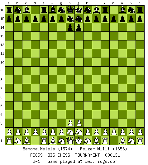 Last move : 0-1 2024 March 16 13:35:58 [Event "FICGS__BIG_CHESS__TOURNAMENT__000131"] [Site "FICGS"] [Date "2024.02.15"] [Round "1"] [White "Benone,Mateia"] [Black "Pelzer,Willi"] [Result "0-1"] [WhiteElo "1574"] [BlackElo "1656"] 0-1 This big chess game has been lost on time (started : 2024.02.15 0:47:21) Follow this game move after move (download)The passed Pawn is a criminal, who should be kept under lock and key. Mild measures, such as police surveillance, are not sufficient. (Aaron Nimzovich) Ein Remis kann durch Wiederholung von drei Zügen oder durch einen schlechte Zug erreicht werden. (Savielly Grigorievitsch Tartakower) Yo creo que el Ajedrez posee una magia que es también una ayuda en la edad avanzada. Una rodilla reumática es olvidada durante una partida de Ajedrez y otros eventos pueden parecer algo sin importancia comparada a una catástrofe en el tablero de Ajedrez. (Vlastimil Hort) On a dit que l'homme se distingue de l'animal par le fait qu'il achète plus de livres qu'il ne peut en lire. Je voudrais suggérer qu'inclure à la liste des livres quelques livres d'échecs rendrait la distinction manifeste. (Edward Lasker) It's only after you lost everything, Tyler says, that you're free to do anything. (Chuck Palahniuk, Fight Club)