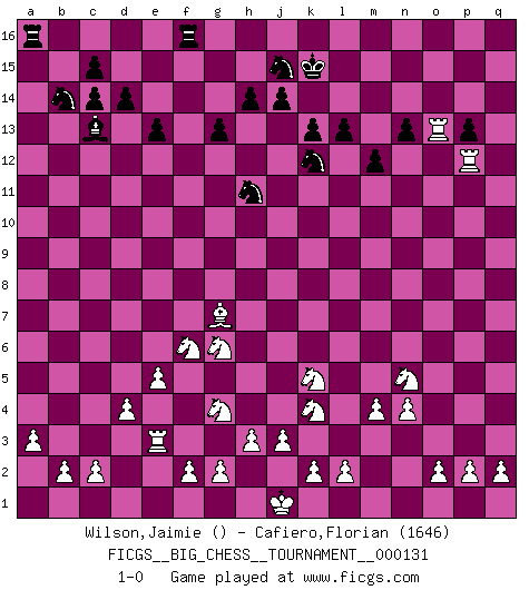 Last move : 1-0 2024 June 20 16:47:55 [Event "FICGS__BIG_CHESS__TOURNAMENT__000131"] [Site "FICGS"] [Date "2024.02.15"] [Round "1"] [White "Wilson,Jaimie"] [Black "Cafiero,Florian"] [Result "1-0"] [WhiteElo ""] [BlackElo "1646"] 1.d2-d4 n15-n13 2.m2-m4 e15-e13 3.j2-k4 k15-k13 4.e2-e4 m15-m13 5.f1-c4 l15-l14 6.h1-o7 j15-h13 7.k1-l3 p16-o14 8.n2-n4 f16-c13 9.p1-o3 d15-d14 10.b1-c3 g15-g13 11.o1-j6 h16-f14 12.h2-g4 b16-d15 13.c1-h6 a15-a13 14.e1-e3 d15-b14 15.e3-f3 f14-e14 16.o3-n5 e14-b11 17.c4-b3 l16-n14 18.g1-e2 o16-g9 19.l3-k5 g16-j15 20.l1-q6 g9-k12 21.q6-k12 h13-k12 22.o7-f15 b11-f15 23.f3-f15 c16-d15 24.m1-m3 e16-f16 25.f15-f4 f16-f4 26.e2-f4 k16-m15 27.a1-e1 j16-k15 28.c3-d5 m16-f16 29.d5-f6 d15-c14 30.q1-n1 h15-j13 31.m3-p3 p15-p14 32.e4-e5 n14-p12 33.j6-p12 q15-q13 34.p12-q11 o14-p12 35.q11-l6 m15-o14 36.l6-c14 b15-c14 37.e1-e3 a16-b16 38.h6-a13 b16-a16 39.a13-g7 m13-m12 40.n1-n3 j13-h11 41.a2-a3 q16-o16 42.n3-o3 l14-l13 43.f4-g6 o14-n12 44.b3-o15 p14-p13 45.o15-q13 n12-o14 46.q13-p12 o14-p12 47.p3-p12 o16-o13 48.o3-o13 1-0 Follow this game move after move (download)I'm not a materialistic person, in that, I don't suffer the lack or loss of money. The absence of worldly goods I don't look back on. For Chess is a way I can be as materialistic as I want without having to sell my soul. (Jamie Walter Adams) Im Wettkampf zwischen starken Meistern kommen Fehler sehr selten vor, deshalb ist es mit bloßem Warten nicht getan. (José Raúl Capablanca) Ayuda a tus piezas para que ellas te puedan ayudar. (Paul Morphy) Le plus grand jeu de l'esprit jamais inventé, plus vous l'apprenez, plus vous y prenez du plaisir. (Garry Kasparov) The greatest con, that he ever pulled... was making you believe... that he is you. (Revolver, movie)