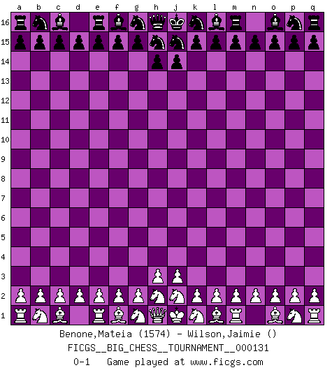 Last move : 0-1 2024 March 16 13:35:58 [Event "FICGS__BIG_CHESS__TOURNAMENT__000131"] [Site "FICGS"] [Date "2024.02.15"] [Round "1"] [White "Benone,Mateia"] [Black "Wilson,Jaimie"] [Result "0-1"] [WhiteElo "1574"] [BlackElo ""] 0-1 This big chess game has been lost on time (started : 2024.02.15 0:47:21) Follow this game move after move (download)Fischer is an American Chess tragedy on par with Morphy and Pillsbury. (Mig Greengard) Ein unbeabsichtigtes Patt ist der Gipfel der Dummheit. (Anonymous) Botvinnik trataba de restarle el misterio al Ajedrez, siempre relacionandolo a situaciones de la vida ordinaria. El gustaba de llamar al Ajedrez un típico problema inexacto similar a aquellos de los cuales la gente siempre tiene que enfrentarse en la vida cotidiana. (Garry Kasparov) Si je n'étais pas joueur d'échecs, je serais le meilleur dans quelque chose d'autre. (Anatoli Karpov) Creativity is allowing yourself to make mistakes. Art is knowing which ones to keep. (Scott Adams)