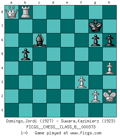 Last move : 1-0 2024 September 23 16:54:25 [Event "FICGS__CHESS__CLASS_B__000373"] [Site "FICGS"] [Date "2024.02.15"] [Round "1"] [White "Domingo,Jordi"] [Black "Suwara,Kazimierz"] [Result "1-0"] [WhiteElo "1927"] [BlackElo "1923"] 1.e4 c5 2.Nf3 Nc6 3.d4 cxd4 4.Nxd4 Nf6 5.Nc3 e5 6.Ndb5 d6 7.Nd5 Nxd5 8.exd5 Ne7 9.a4 Nf5 10.Bd3 a6 11.Na3 Be7 12.Nc4 O-O 13.a5 Bd7 14.Nb6 Rb8 15.O-O g6 16.c4 Bf6 17.Bxf5 Bxf5 18.Be3 e4 19.Qd2 Re8 20.h3 Qe7 21.Rac1 Rbd8 22.b4 Bd7 23.c5 Bb5 24.Rfd1 dxc5 25.d6 Qe6 26.d7 Re7 27.Rxc5 Bd3 28.Rc7 Rexd7 29.Nxd7 Rxd7 30.Rxd7 Qxd7 31.Bh6 Qe8 32.Qe3 Qd8 33.Qa7 Bg5 34.Bxg5 Qxg5 35.Qxb7 h6 36.Qc8+ Kh7 37.Qc1 Qb5 38.Qf4 Bc4 39.Qxe4 Qa4 40.Rd4 Bb5 41.Kh2 Qa2 42.Qf4 Qe6 43.h4 Qe7 44.Qd6 Qe1 45.Qf6 Qe6 46.Qxe6 fxe6 47.Rd6 Kg7 48.Rxe6 Bd3 49.Rb6 Kf7 50.b5 axb5 51.a6 Be4 52.a7 Kg7 53.f3 Ba8 54.Rb8 Bc6 55.a8Q 1-0 Follow this game move after move (download)If Chess is a science, it's a most inexact one. If Chess is an art, it is too exacting to be seen as one. If Chess is a sport, it's too esoteric. If Chess is a game, it's too demanding to be just a game. If Chess is a mistress, she's a demanding one. If Chess is a passion, it's a rewarding one. If Chess is life, it's a sad one. (Unknown) Mutter, ich bin eben Ex-Weltmeister geworden. --beim nach Hause Kommen nach dem Verlust des WM-Titels an Mihail Botvinnik -- (Mikhail Nekhemyevich Tal) Es el objetivo de la escuela moderna no tratar cada posición de acuerdo a una regla general, sino de acuerdo al principio inherente en la posición. (Richard Reti) Les réformistes prétendent que les progrès de la théorie conduiront à la disparition des échecs, et qu'il faut, pour leur rendre vie, en remanier les règles. En réalité, qu'exprime cette affirmation? Le mépris de l'intuition, de l'imagination et de tous les autres éléments qui font des échecs un art. (Alexander Alekhine) I feel so... helpless. (C-3PO in Star Wars ep.3)