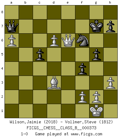 Last move : 1-0 2024 October 27 11:40:34 [Event "FICGS__CHESS__CLASS_B__000373"] [Site "FICGS"] [Date "2024.02.15"] [Round "1"] [White "Wilson,Jaimie"] [Black "Vollmer,Steve"] [Result "1-0"] [WhiteElo "2018"] [BlackElo "1812"] 1.c4 Nf6 2.Nf3 g6 3.Nc3 Bg7 4.e4 d6 5.d4 O-O 6.Be2 c5 7.h3 cxd4 8.Nxd4 Nc6 9.Be3 a6 10.O-O e5 11.Nxc6 bxc6 12.b4 Qc7 13.Qd2 Bb7 14.a4 Rfd8 15.a5 c5 16.Qd3 Ne8 17.Rfb1 Rdb8 18.bxc5 dxc5 19.Rb6 Bf8 20.Rab1 Bc6 21.Nd5 Bxd5 22.Rxb8 Rxb8 23.Rxb8 Qxb8 24.cxd5 Nf6 25.Qxa6 Nxe4 26.Qd3 f5 27.a6 Bd6 28.Qa3 Qa7 29.Qa4 Kf7 30.Bd3 Nf6 31.Qc6 f4 32.Bxf4 exf4 33.Qxd6 g5 34.Qe6+ Kg7 35.d6 1-0 Follow this game move after move (download)Bobby Fischer is the greatest Chess genius of all time ! (Alexander Kotov) Ich hatte Zahnschmerzen im ersten Spiel. In der zweiten Partie tat mir der Kopf weh. In der dritten war es eine Rheuma-Attacke und während der vierten fühlte ich mich nicht gut. Und in der fünften? Nun, man muss doch nicht jedes Spiel gewinnen, oder? (Savielly Grigorievitsch Tartakower) El Ajedrez es un cuento de Hadas de las 1001 metidas de pata. (Savielly Tartakower) Les Echecs, c'est l'art de la guerre sans les charniers, c'est la résurrection des morts tombés au champ d'honneur, l'espoir perpétuel, la suprématie de l'intelligence sur la force, la culture de l'esprit. (F. Szpiner) True nature is revealed in times of difficulty. (Chinese proverb)