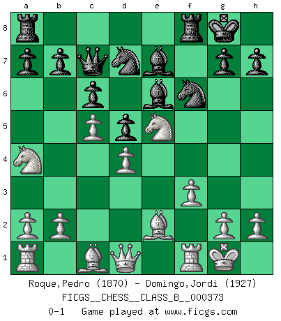 Last move : 0-1 2024 July 1 0:35:48 [Event "FICGS__CHESS__CLASS_B__000373"] [Site "FICGS"] [Date "2024.02.15"] [Round "1"] [White "Roque,Pedro"] [Black "Domingo,Jordi"] [Result "0-1"] [WhiteElo "1870"] [BlackElo "1927"] 1.e4 e5 2.Nf3 f5 3.Nxe5 Qf6 4.d4 d6 5.Nc4 fxe4 6.Nc3 Qg6 7.f3 Be7 8.Nxe4 d5 9.Ne5 Qb6 10.Nc3 Nf6 11.Be2 O-O 12.Na4 Qa5+ 13.c3 c6 14.O-O Qc7 15.c4 Be6 16.c5 Nbd7 0-1 This chess game has been lost on time (started : 2024.02.15 12:11:38) Follow this game move after move (download)The battle for the ultimate truth will never be won. And that's why Chess is so fascinating. (Hans Kmoch) Rauchen ist dem Schachspieler bei seiner Arbeit, also im Wettkampf, untersagt. (Viktor Kortschnoi) Fischer es una tragedia del Ajedrez Americano a la par con Morphy y Pillsbury. (Mig Greengard) Même si l'adversaire joue le coup analysé précédemment, recommencez l'analyse en voyant la nouvelle position. Première règle de Blumenfeld Perfection is achieved, not when there is nothing more to add, but when there is nothing left to take away. (Antoine de Saint-Exupéry)