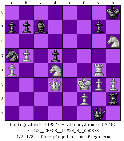 Last move : 1/2-1/2 2024 July 26 18:44:41 [Event "FICGS__CHESS__CLASS_B__000373"] [Site "FICGS"] [Date "2024.02.15"] [Round "1"] [White "Domingo,Jordi"] [Black "Wilson,Jaimie"] [Result "1/2-1/2"] [WhiteElo "1927"] [BlackElo "2018"] 1.e4 e5 2.Nf3 Nc6 3.Bc4 Nf6 4.d3 Be7 5.O-O O-O 6.h3 d6 7.a4 Na5 8.Ba2 c5 9.c3 Nc6 10.Re1 Be6 11.Bxe6 fxe6 12.Na3 Qe8 13.Rb1 Qg6 14.b4 cxb4 15.cxb4 Nh5 16.b5 Na5 17.Kh2 Rac8 18.Nc2 Nf4 19.Bxf4 Rxf4 20.Ne3 Rcf8 21.Rc1 Bd8 22.Rc8 h6 23.Qc2 Bb6 24.Re2 Rxc8 25.Qxc8+ Kh7 26.Qc3 Qf7 27.Rc2 Qf8 28.Qb4 Rf7 29.Ng4 Qd8 30.Qb2 Qf8 31.Qa2 Re7 32.Kg1 Re8 33.Rd2 Kg8 34.d4 exd4 35.Nxd4 Qf7 36.Rd3 d5 37.exd5 exd5 38.Rf3 Re1+ 39.Kh2 Qc7+ 40.Rg3 Qc4 41.Nxh6+ Kh7 42.Qd2 Qc1 43.Qd3+ Kh8 44.Nf7+ Kg8 45.Rg4 Bc7+ 46.g3 Rh1+ 47.Kg2 Qg1+ 48.Kf3 Rh2 49.Nh6+ Kh8 50.Nf7+ Kg8 51.Nh6+ Kh8 1/2-1/2 Follow this game move after move (download)Morphy was probably the greatest genius of them all. (Bobby Fischer) Wenn ich gewinne bin ich ein Genie. Wenn nicht, dann bin ich keines. (Robert James Fischer) Ayuda a tus piezas para que ellas te puedan ayudar. (Paul Morphy) Le jeu d'échecs fait naître et fortifie en nous plusieurs qualités précieuses dans le cours de l'existence, telles que la prévoyance, la circonspection, la prudence, et la persévérance. (Benjamin Franklin - 1783, la morale des échecs) The general who wins the battle makes many calculations in his temple before the battle is fought. The general who loses makes but few calculations beforehand. (Sun Tzu)