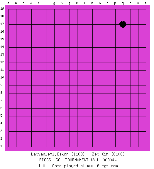 Last move : 1-0 2007 October 13 18:35:11 [Event "FICGS__GO__TOURNAMENT_KYU__000044"] [Site "FICGS"] [Date "2007.09.13"] [Round "1"] [Black "Latvaniemi,Oskar"] [White "Zet,Kim"] [Result "1-0"] [Rating 1 "1100"] [Rating 2 "0100"] 1.q17 1-0 This go game has been lost on time (started : 2007.09.13 13:31:26) Here are the names of the openings (joseki) played in the four corners : Player Black won this Go (weiqi, baduk) game. Follow this game move after move (download)If you have lost four corners, resign. (Anonymous) War is the child of passion, passion is the child of narcissism and narcissism is the child. (...) Another game ? (Thibault de Vassal)