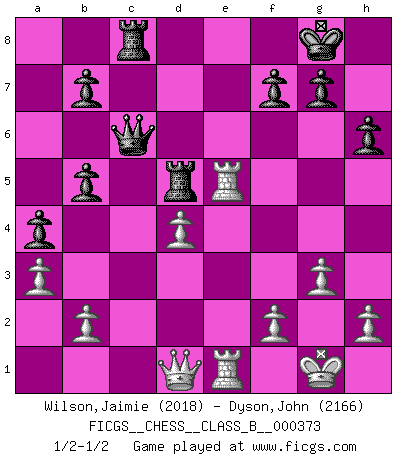 Last move : 1/2-1/2 2024 July 31 18:9:9 [Event "FICGS__CHESS__CLASS_B__000373"] [Site "FICGS"] [Date "2024.02.15"] [Round "1"] [White "Wilson,Jaimie"] [Black "Dyson,John"] [Result "1/2-1/2"] [WhiteElo "2018"] [BlackElo "2166"] 1.c4 e5 2.Nc3 Nf6 3.Nf3 Nc6 4.g3 d5 5.cxd5 Nxd5 6.Bg2 Bc5 7.O-O O-O 8.d3 h6 9.Nxd5 Qxd5 10.Bd2 Rd8 11.Qc2 Qd6 12.a3 a5 13.Rac1 Bb6 14.Be3 a4 15.Nd2 Nd4 16.Bxd4 Qxd4 17.Qb1 Qg4 18.Nc4 Qxe2 19.Rce1 Qg4 20.Nxb6 cxb6 21.Rxe5 Bf5 22.Be4 Bxe4 23.Rxe4 Qd7 24.Rfe1 b5 25.Qd1 Qc6 26.d4 Rac8 27.Re5 Rd5 1/2-1/2 Follow this game move after move (download)Of all my Russian books, the defense contains and diffuses the greatest 'warmth' which may seem odd seeing how supremely abstract Chess is supposed to be. (Vladimir Nabokov) Schach sollte überall auf der Welt Schulfach werden. Es fördert die geistige Auseinandersetzung. Es lehrt die Demut in der Niederlage. (Garry Kasparov) Es el objetivo de la escuela moderna no tratar cada posición de acuerdo a una regla general, sino de acuerdo al principio inherente en la posición. (Richard Reti) Plusieurs personnes se sont demandées comment Tal faisait pour gagner... En fait, c'est très simple ! Il met ses pièces au centre de l'échiquier et les sacrifie quelque part ! (David Bronstein) Internal peace cannot coexist with external war. (Don Groves)