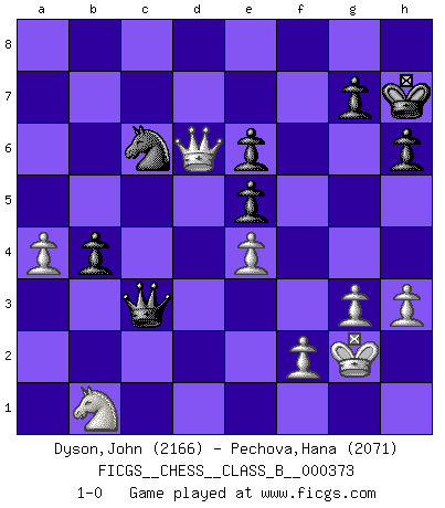 Last move : 1-0 2025 June 6 16:39:5 [Event "FICGS__CHESS__CLASS_B__000373"] [Site "FICGS"] [Date "2024.02.15"] [Round "1"] [White "Dyson,John"] [Black "Pechova,Hana"] [Result "1-0"] [WhiteElo "2166"] [BlackElo "2071"] 1.e4 e5 2.Nf3 Nc6 3.Bb5 a6 4.Ba4 Nf6 5.O-O Be7 6.Re1 b5 7.Bb3 O-O 8.h3 Bb7 9.d3 d6 10.a3 Na5 11.Ba2 c5 12.Nbd2 Nc6 13.Nf1 Bc8 14.c3 Be6 15.Bxe6 fxe6 16.Be3 h6 17.b4 Qd7 18.bxc5 dxc5 19.a4 b4 20.cxb4 cxb4 21.Qe2 Nh7 22.Rec1 Rac8 23.Qa2 Ng5 24.N1d2 Nxf3+ 25.Nxf3 Rb8 26.Qe2 Rfc8 27.g3 Bd6 28.Qb2 Kh7 29.Rab1 Be7 30.Qd2 Bd6 31.Qb2 Be7 32.Qd2 a5 33.Kg2 Bd8 34.Qc2 Bf6 35.Nd2 Bd8 36.Nf3 Qe8 37.Qd2 Bb6 38.Bxb6 Rxb6 39.Rc5 Qd7 40.Rbc1 b3 41.R5c4 Rb4 42.Rb1 Rcb8 43.Qc3 Rxc4 44.dxc4 Rb4 45.Rxb3 Qd1 46.Rxb4 axb4 47.Qd2 Qb3 48.Qd6 Qxc4 49.Nd2 Qc3 50.Nb1 1-0 This chess game has been lost on time (started : 2024.02.15 12:11:38) Follow this game move after move (download)The most powerful weapon in Chess is to have the next move. (David Bronstein) Ich bin es gewohnt, das die Jugend mir überhaupt keinen Respekt entgegenbringt. (Alexander Morozewich) EL Ajedrez es como la vida. (Boris Spassky) Echiquier : carré parfait, comme la Jérusalem nouvelle décrite par l'auteur de l'Apocalypse, huit cases sur huit, exaltation du chiffre 4, symbole du cosmos aux quatre horizons... où le noir et le blanc, l'ombre et la lumière, le mal et le bien s'entremêlent et se conjuguent. (Robert Couffignal, Le Gambit du poète) All the troubles of the world come from being unable to sit alone in a quiet room. (Blaise Pascal)