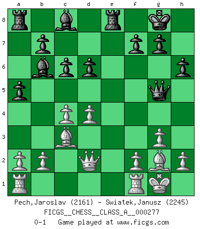 Last move : 0-1 2024 July 7 3:37:17 [Event "FICGS__CHESS__CLASS_A__000277"] [Site "FICGS"] [Date "2024.02.20"] [Round "1"] [White "Pech,Jaroslav"] [Black "Swiatek,Janusz"] [Result "0-1"] [WhiteElo "2161"] [BlackElo "2245"] 1.c4 e5 2.Nc3 Nf6 3.Nf3 Nc6 4.g3 Nd4 5.Bg2 Nxf3+ 6.Bxf3 Bb4 7.O-O O-O 8.d3 h6 9.Bd2 Bc5 10.Ne4 Nxe4 11.Bxe4 c6 12.Bg2 a5 13.Bc3 d6 14.e3 Re8 15.Qd2 Bb6 16.d4 exd4 17.exd4 Qg5 0-1 This chess game has been lost on time (started : 2024.02.20 21:36:33) Follow this game move after move (download)Chess is a forcing house where the fruits of character can ripen more fully than in life. (Edward Morgan Foster) Im Fernschach kannst du während dem Spiel rauchen. (John Christen Knudsen) La partida mas dura de ganar es una partida ganada. (Emanuel Lasker) Les réformistes prétendent que les progrès de la théorie conduiront à la disparition des échecs, et qu'il faut, pour leur rendre vie, en remanier les règles. En réalité, qu'exprime cette affirmation? Le mépris de l'intuition, de l'imagination et de tous les autres éléments qui font des échecs un art. (Alexander Alekhine) No, no, you're not thinking; you're just being logical. (Niels Bohr)