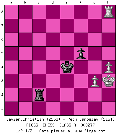 Last move : 1/2-1/2 2025 January 25 21:4:41 [Event "FICGS__CHESS__CLASS_A__000277"] [Site "FICGS"] [Date "2024.02.20"] [Round "1"] [White "Javier,Christian"] [Black "Pech,Jaroslav"] [Result "1/2-1/2"] [WhiteElo "2263"] [BlackElo "2161"] 1.e4 c5 2.Nf3 Nc6 3.Bb5 d6 4.O-O Bd7 5.Re1 Nf6 6.c3 a6 7.Bf1 Bg4 8.d4 cxd4 9.cxd4 d5 10.e5 Ng8 11.Nbd2 e6 12.h3 Bh5 13.Re3 Nge7 14.Be2 Bg6 15.Rc3 Nc8 16.Nb3 Bb4 17.Bg5 f6 18.Rxc6 bxc6 19.Bf4 Qb6 20.Qc1 O-O 21.a3 Be7 22.Nc5 Bxc5 23.dxc5 Qb7 24.Nd4 Ne7 25.exf6 Rxf6 26.Be5 Nf5 27.Bxf6 gxf6 28.Nxf5 Bxf5 29.a4 Rb8 30.Qd2 e5 31.Ra3 Bg6 32.b4 Qxb4 33.Qxb4 Rxb4 34.Bxa6 d4 35.a5 Kg7 36.Be2 d3 37.Bxd3 Bxd3 38.Rxd3 Ra4 39.Rd6 Ra1+ 40.Kh2 Rxa5 41.Rxc6 Ra2 42.Kg3 Ra3+ 43.Kh2 Ra2 44.Kg3 Ra3+ 45.Kh4 Ra2 46.Rc7+ Kg6 47.Kg3 Ra3+ 48.Kh4 Ra2 49.Kg3 Ra3+ 50.f3 Rc3 51.Kh2 h6 52.c6 Kf5 53.Rh7 Rxc6 54.Rxh6 Kg5 55.Rh8 f5 56.h4+ Kf4 57.Kh3 Rc1 58.Kh2 e4 59.fxe4 Kxe4 60.g3 Rc2+ 61.Kh3 1/2-1/2 Follow this game move after move (download)I don't believe in psychology. I believe in good moves. (Bobby Fischer) Es liegt in der Natur, vernüftig zu denken und unlogisch zu handeln. (Anatole France) El Ajedrez es parte de una cultura y si una cultura esta en decadencia, entonces también el Ajedrez declinará. (Mikhail Botvinnik) La tactique est l'élément le plus important du milieu de jeu. (Siegbert Tarrasch) Life doesn't imitate art, it imitates bad television. (Woody Allen)