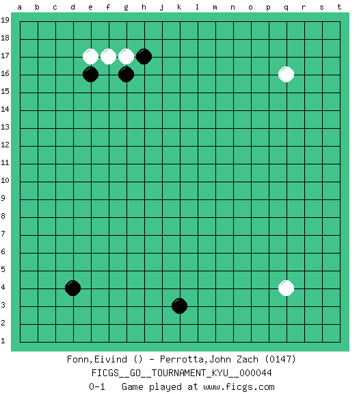 Last move : 0-1 2007 November 1 23:46:37 [Event "FICGS__GO__TOURNAMENT_KYU__000044"] [Site "FICGS"] [Date "2007.09.13"] [Round "1"] [Black "Fonn,Eivind"] [White "Perrotta,John Zach"] [Result "0-1"] [Rating 2 "0147"] 1.d4 q16 2.e16 q4 3.k3 g17 4.h17 e17 5.g16 f17 0-1 This go game has been lost on time (started : 2007.09.13 13:31:26) Here are the names of the openings (joseki) played in the four corners : Corner d16 : e16 g17 Takamoku (Gomok, Gaomu`) 5-4 Point. The takamoku (high) point (5-4). With its emphasis on influence, the 5-4 point complements the 4-4 (hoshi) point in creating an influence-oriented fuseki. Player White won this Go (weiqi, baduk) game. Follow this game move after move (download)... {it is} something unearthly... if there are sentient beings on other planets, then they play go. (Emanuel Lasker, chess world champion) The Internet is the first thing that humanity has build that humanity doesn't understand, the largest experiment in anarchy that we have ever had. (Eric Schmidt)